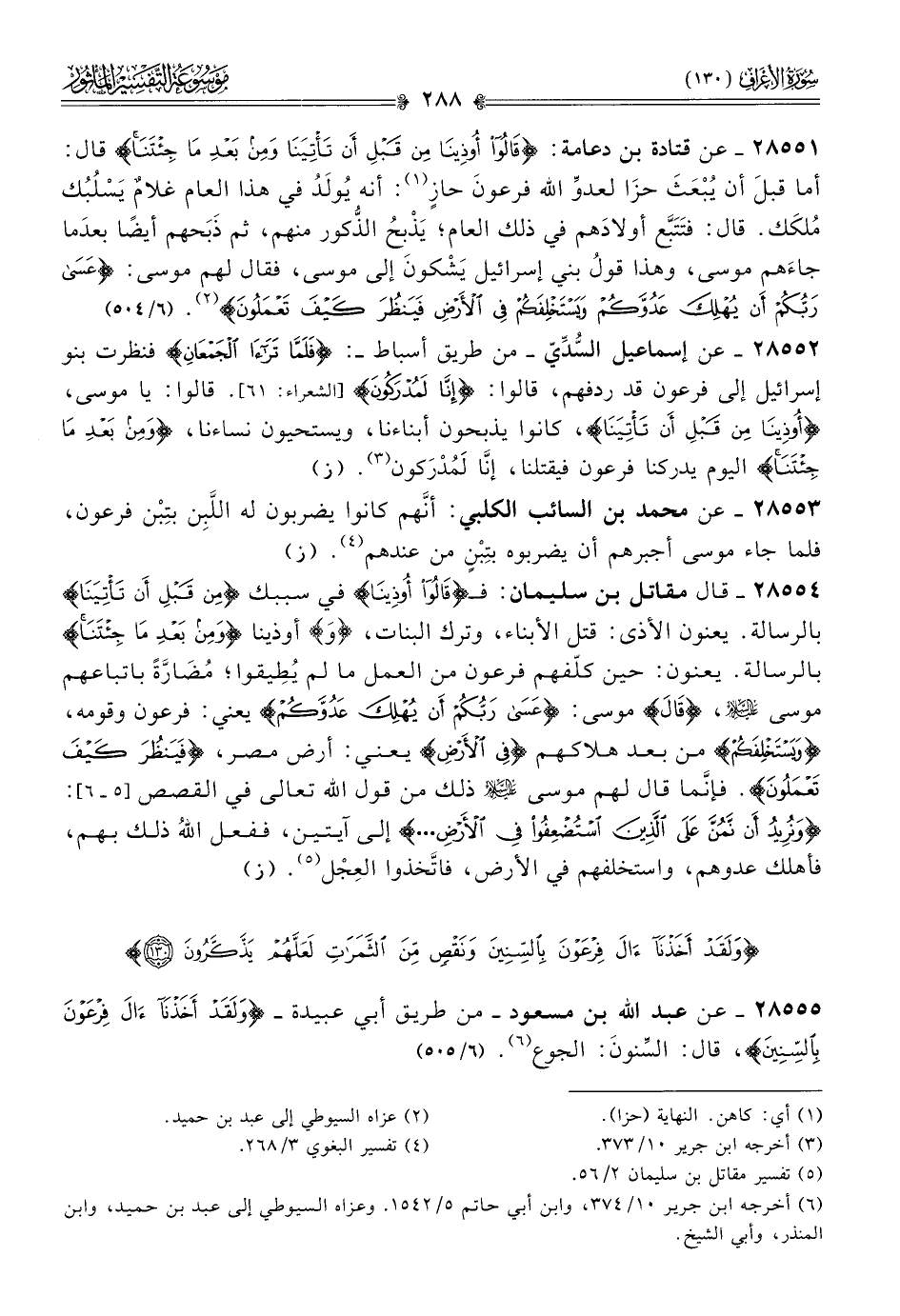 ٢٨٥٥٥ - عن عبد الله بن مسعود -من طريق أبي عبيدة- {ولقد أخذنا آل فرعون بالسنين}، قال: السِّنونَ: الجوع (¬٦). (٦/ ٥٠٥)