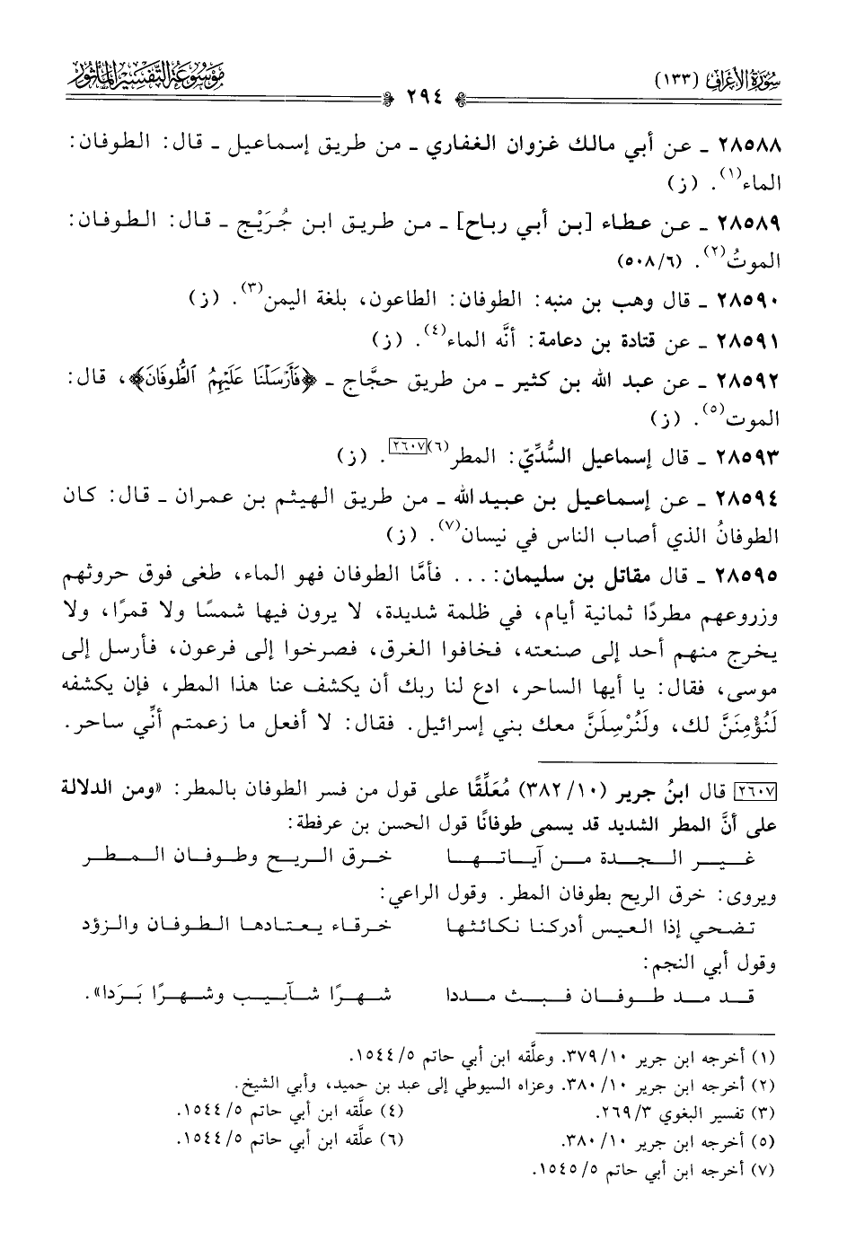 ٢٨٥٨٩ - عن عطاء [بن أبي رباح]-من طريق ابن جُرَيْج- قال: الطوفان: الموتُ (¬٢). (٦/ ٥٠٨)