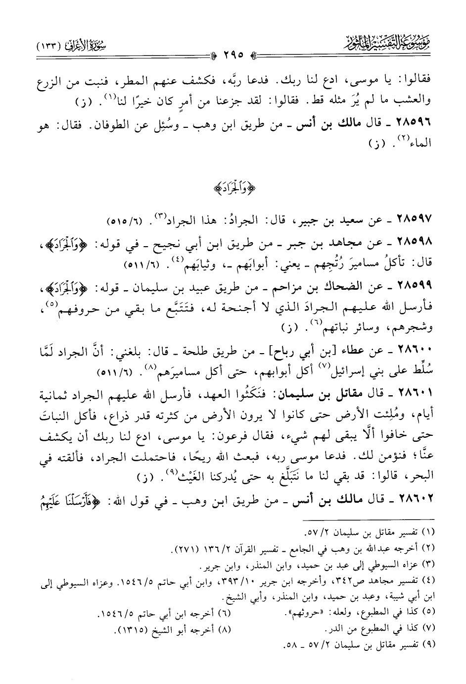 ٢٨٥٩٩ - عن الضحاك بن مزاحم -من طريق عبيد بن سليمان- قوله: {والجراد}، فأرسل الله عليهم الجرادَ الذي لا أجنحة له، فتَتَبَّع ما بقي من حروفهم (¬٥)، وشجرهم، وسائر نباتهم (¬٦). (ز)