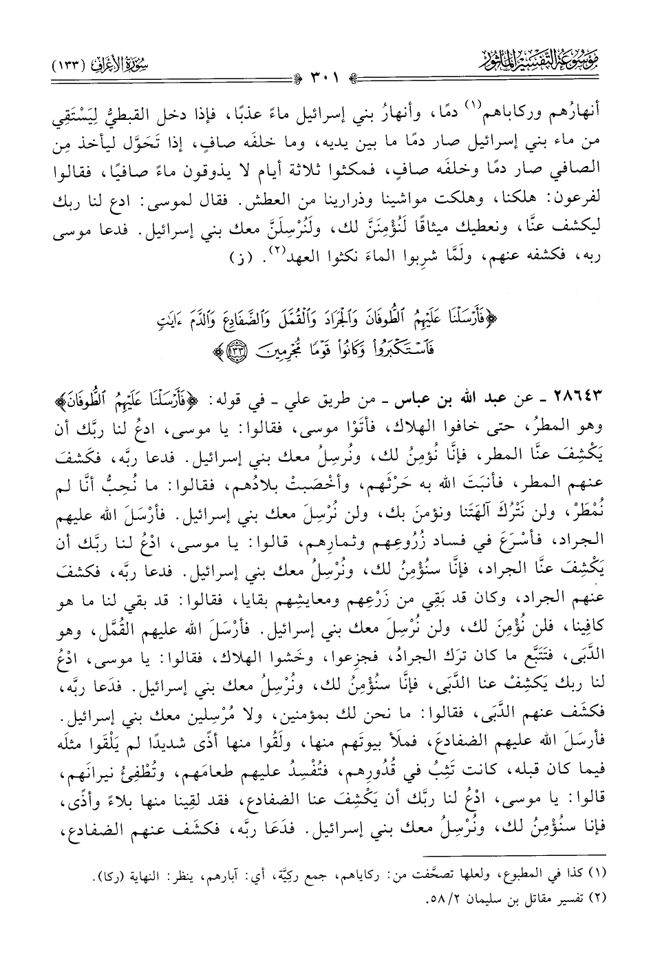٢٨٦٤٣ - عن عبد الله بن عباس -من طريق علي- في قوله: {فأرسلنا عليهم الطوفان} وهو المطرُ، حتى خافوا الهلاك، فأتَوْا موسى، فقالوا: يا موسى، ادعُ لنا ربَّك أن يَكْشِفَ عنّا المطر، فإنّا نُؤمِنُ لك، ونُرسِلُ معك بني إسرائيل. فدعا ربَّه، فكَشفَ عنهم المطر، فأنبَتَ الله به حَرْثَهم، وأخْصَبتْ بلادُهم، فقالوا: ما نُحِبُّ أنّا لم نُمْطَرْ، ولن نَتْرُكَ آلهَتَنا ونؤمنَ بك، ولن نُرْسِلَ معك بني إسرائيل. فأرْسَلَ الله عليهم الجراد، فأسْرَعَ في فساد زُرُوعِهم وثمارِهم، قالوا: يا موسى، ادْعُ لنا ربَّك أن يَكْشِفَ عنّا الجراد، فإنّا سنُؤْمِنُ لك، ونُرْسِلُ معك بني إسرائيل. فدعا ربَّه، فكشفَ عنهم الجراد، وكان قد بَقِي من زَرْعِهم ومعايشِهم بقايا، فقالوا: قد بقي لنا ما هو كافِينا، فلن نُؤْمِنَ لك، ولن نُرْسِلَ معك بني إسرائيل. فأرْسَلَ الله عليهم القُمَّل، وهو الدَّبى، فتَتَبَّع ما كان ترَك الجرادُ، فجزِعوا، وخَشوا الهلاك، فقالوا: يا موسى، ادْعُ لنا ربك يَكشِفْ عنا الدَّبى، فإنّا سنُؤْمِنُ لك، ونُرْسِلُ معك بني إسرائيل. فدَعا ربَّه، فكشَف عنهم الدَّبى، فقالوا: ما نحن لك بمؤمنين، ولا مُرْسِلين معك بني إسرائيل. فأرسَلَ الله عليهم الضفادعَ، فملَأ بيوتَهم منها، ولَقُوا منها أذًى شديدًا لم يَلْقَوا مثلَه فيما كان قبله، كانت تَثِبُ في قُدُورِهم، فتُفْسِدُ عليهم طعامَهم، وتُطْفِئُ نيرانَهم، قالوا: يا موسى، ادْعُ لنا ربَّك أن يَكْشِفَ عنا الضفادع، فقد لقِينا منها بلاءً وأذًى، فإنا سنُؤْمِنُ لك، ونُرْسِلُ معك بني إسرائيل. فدَعا ربَّه، فكشَف عنهم الضفادع،
