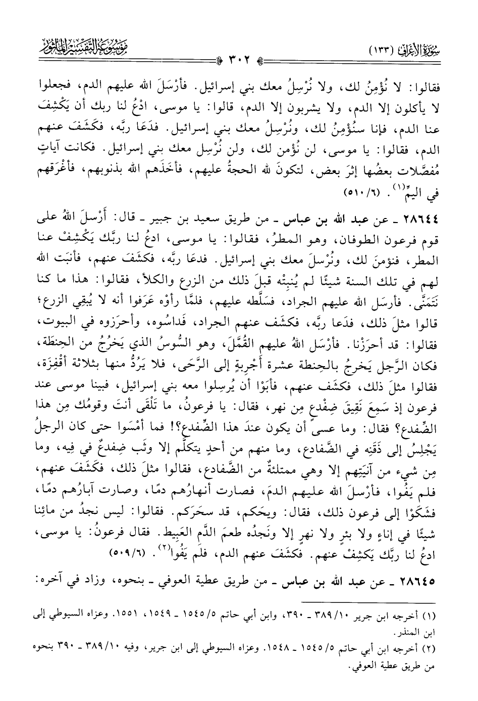 ٢٨٦٤٤ - عن عبد الله بن عباس -من طريق سعيد بن جبير- قال: أرْسلَ اللهُ على قوم فرعون الطوفان، وهو المطرُ، فقالوا: يا موسى، ادعُ لنا ربَّك يَكْشِفْ عنا المطر، فنؤمنَ لك، ونُرْسلَ معك بني إسرائيل. فدعا ربَّه، فكشَفَ عنهم، فأنبَت الله لهم في تلك السنة شيئًا لم يُنبِتْه قبلَ ذلك من الزرع والكلأ، فقالوا: هذا ما كنا نَتَمَنّى. فأرسَل الله عليهم الجراد، فسَلَّطه عليهم، فلمّا رأوْه عَرَفوا أنه لا يُبقِي الزرع؛ قالوا مثلَ ذلك، فدَعا ربَّه، فكشَف عنهم الجراد، فَداسُوه، وأحرَزوه في البيوت، فقالوا: قد أحرَزْنا. فأرْسَل اللهُ عليهم القُمَّلَ، وهو السُّوسُ الذي يَخرُجُ من الحِنطَة، فكان الرَّجل يَخرجُ بالحِنطة عشرة أجْرِبةٍ إلى الرَّحى، فلا يَرُدُّ منها بثلاثة أقْفِزَة، فقالوا مثلَ ذلك، فكشَف عنهم، فأبَوْا أن يُرسِلوا معه بني إسرائيل، فبينا موسى عند فرعون إذ سَمِعَ نَقِيقَ ضِفْدعٍ مِن نهر، فقال: يا فرعونُ، ما تَلْقى أنتَ وقومُك مِن هذا الضِّفدع؟ فقال: وما عسى أن يكون عندَ هذا الضِّفدع؟! فما أمْسَوا حتى كان الرجلُ يَجْلِسُ إلى ذَقَنِه في الضَّفادع، وما منهم من أحدٍ يتكلَّم إلا وثَب ضِفدعٌ في فِيه، وما مِن شيء من آنيَتِهم إلا وهي ممتلئةٌ من الضَّفادع، فقالوا مثلَ ذلك، فكَشَفَ عنهم، فلم يَفُوا، فأرْسلَ الله عليهم الدمَ، فصارت أنهارُهم دمًا، وصارت آبارُهم دمًا، فشَكَوْا إلى فرعون ذلك، فقال: ويحَكم، قد سحَرَكم. فقالوا: ليس نجدُ من مائِنا شيئًا في إناءٍ ولا بئرٍ ولا نهرٍ إلا ونَجدُه طعمَ الدَّمِ العَبِيط. فقال فرعونُ: يا موسى، ادعُ لنا ربَّك يَكشِفْ عنهم. فكشَفَ عنهم الدم، فلم يَفُوا (¬٢). (٦/ ٥٠٩)