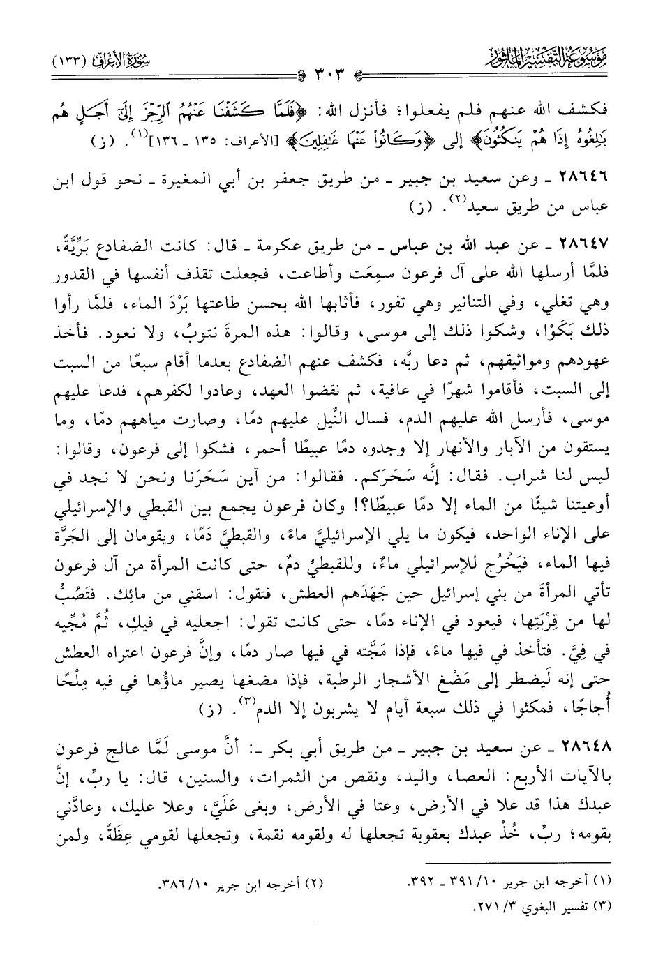 ٢٨٦٤٧ - عن عبد الله بن عباس -من طريق عكرمة- قال: كانت الضفادع بَرِّيَّةً، فلمّا أرسلها الله على آل فرعون سمِعَت وأطاعت، فجعلت تقذف أنفسها في القدور وهي تغلي، وفي التنانير وهي تفور، فأثابها الله بحسن طاعتها بَرْدَ الماء، فلمّا رأوا ذلك بَكَوْا، وشكوا ذلك إلى موسى، وقالوا: هذه المرةَ نتوبُ، ولا نعود. فأخذ عهودهم ومواثيقهم، ثم دعا ربَّه، فكشف عنهم الضفادع بعدما أقام سبعًا من السبت إلى السبت، فأقاموا شهرًا في عافية، ثم نقضوا العهد، وعادوا لكفرهم، فدعا عليهم موسى، فأرسل الله عليهم الدم، فسال النِّيل عليهم دمًا، وصارت مياههم دمًا، وما يستقون من الآبار والأنهار إلا وجدوه دمًا عبيطًا أحمر، فشكوا إلى فرعون، وقالوا: ليس لنا شراب. فقال: إنّه سَحَرَكم. فقالوا: من أين سَحَرَنا ونحن لا نجد في أوعيتنا شيئًا من الماء إلا دمًا عبيطًا؟! وكان فرعون يجمع بين القبطي والإسرائيلي على الإناء الواحد، فيكون ما يلي الإسرائيليَّ ماءً، والقبطيَّ دَمًا، ويقومان إلى الجَرَّة فيها الماء، فيَخْرُج للإسرائيلي ماءٌ، وللقبطيِّ دمٌ، حتى كانت المرأة من آل فرعون تأتي المرأةَ من بني إسرائيل حين جَهَدَهم العطش، فتقول: اسقني من مائِك. فتَصُبُّ لها من قِرْبَتِها، فيعود في الإناء دمًا، حتى كانت تقول: اجعليه في فيكِ، ثُمَّ مُجِّيه في فِيَّ. فتأخذ في فيها ماءً، فإذا مَجَّته في فيها صار دمًا، وإنّ فرعون اعتراه العطش حتى إنه لَيضطر إلى مَضْغ الأشجار الرطبة، فإذا مضغها يصير ماؤُها في فيه مِلْحًا أُجاجًا، فمكثوا في ذلك سبعة أيام لا يشربون إلا الدم (¬٣). (ز)