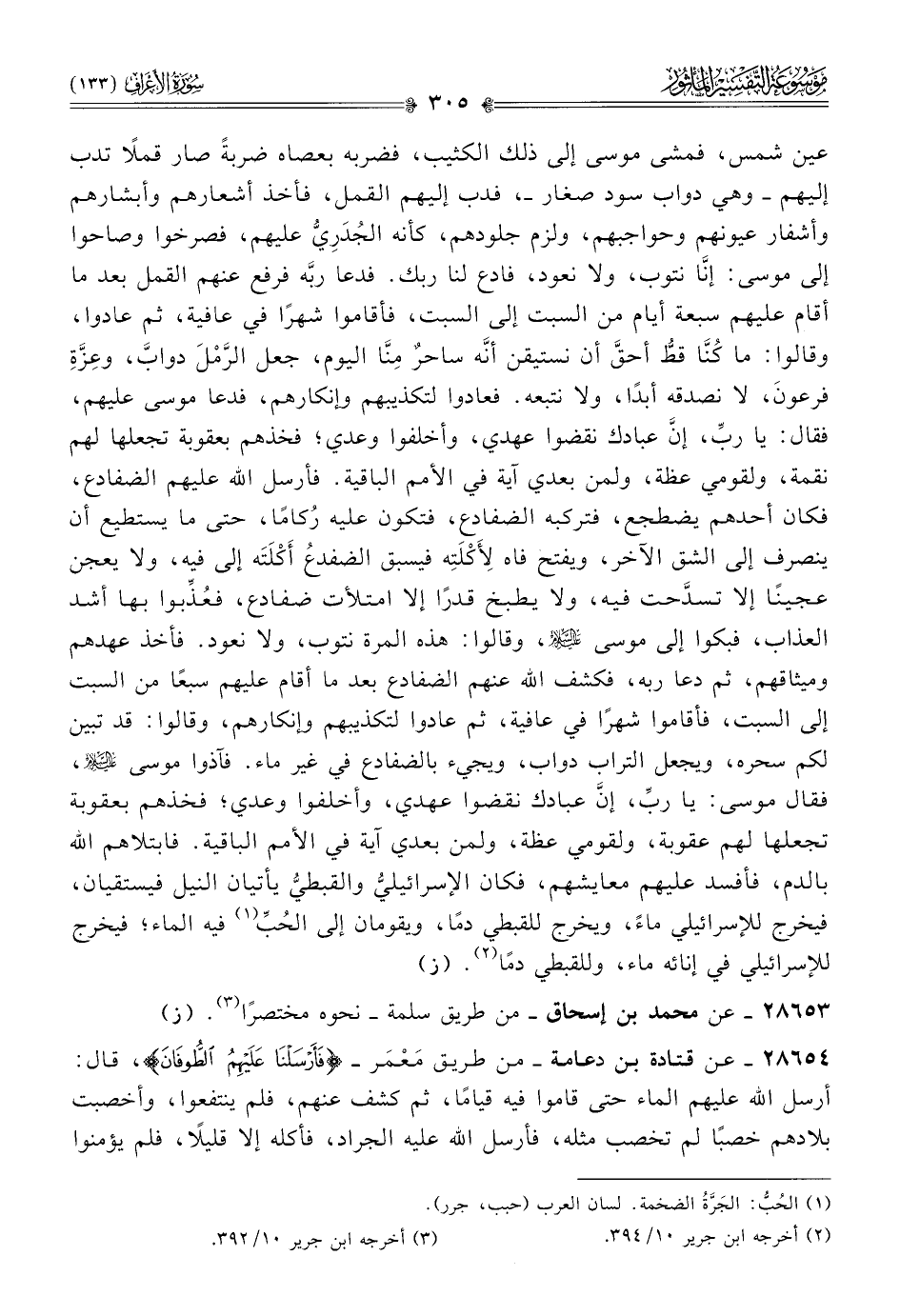 ٢٨٦٥٤ - عن قتادة بن دعامة -من طريق مَعْمَر- {فأرسلنا عليهم الطوفان}، قال: أرسل الله عليهم الماء حتى قاموا فيه قيامًا، ثم كشف عنهم، فلم ينتفعوا، وأخصبت بلادهم خصبًا لم تخصب مثله، فأرسل الله عليه الجراد، فأكله إلا قليلًا، فلم يؤمنوا