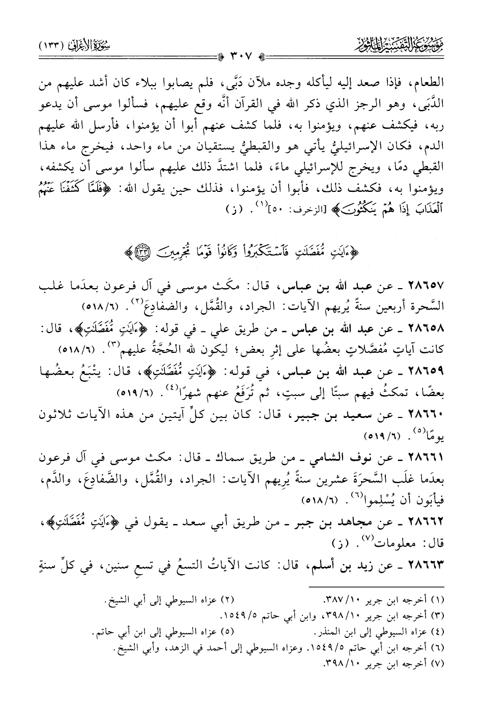 ٢٨٦٦٣ - عن زيد بن أسلم، قال: كانت الآياتُ التسعُ في تسعِ سنين، في كلِّ سنةٍ