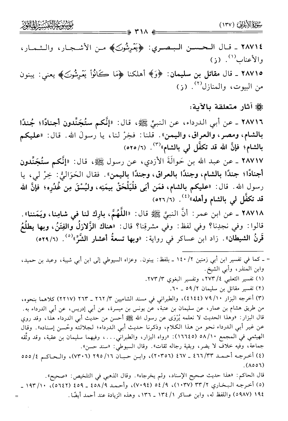 ٢٨٧١٦ - عن أبي الدرداء، عن النبيِّ - صلى الله عليه وسلم -، قال: «إنّكم ستُجَنِّدون أجنادًا؛ جُندًا بالشام، ومصر، والعراق، واليمن». قلنا: فخِرْ لنا، يا رسولَ الله. قال: «عليكم بالشام؛ فإنّ الله قد تكفَّل لي بالشام» (¬٣). (٦/ ٥٢٥)