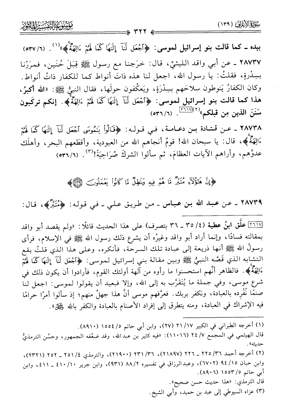 ٢٨٧٣٧ - عن أبي واقد الليثيِّ، قال: خرَجنا مع رسول - صلى الله عليه وسلم - قِبَلَ حُنَين، فمرَرْنا بسِدْرةٍ، فقلتُ: يا رسول الله، اجعل لنا هذه ذاتَ أنواط كما للكفار ذاتُ أنواط. وكان الكفارُ يَنوطون سلاحَهم بسِدْرَةٍ، ويَعكُفون حولَها، فقال النبيُّ - صلى الله عليه وسلم -: «الله أكبرُ، هذا كما قالت بنو إسرائيل لموسى: {اجعلْ لنا إلهًا كما لهم آلهةٌ}. إنكم تركَبون سَنَنَ الذين مِن قبلكم» (¬٢) [٢٦١٧]. (٦/ ٥٣٦)