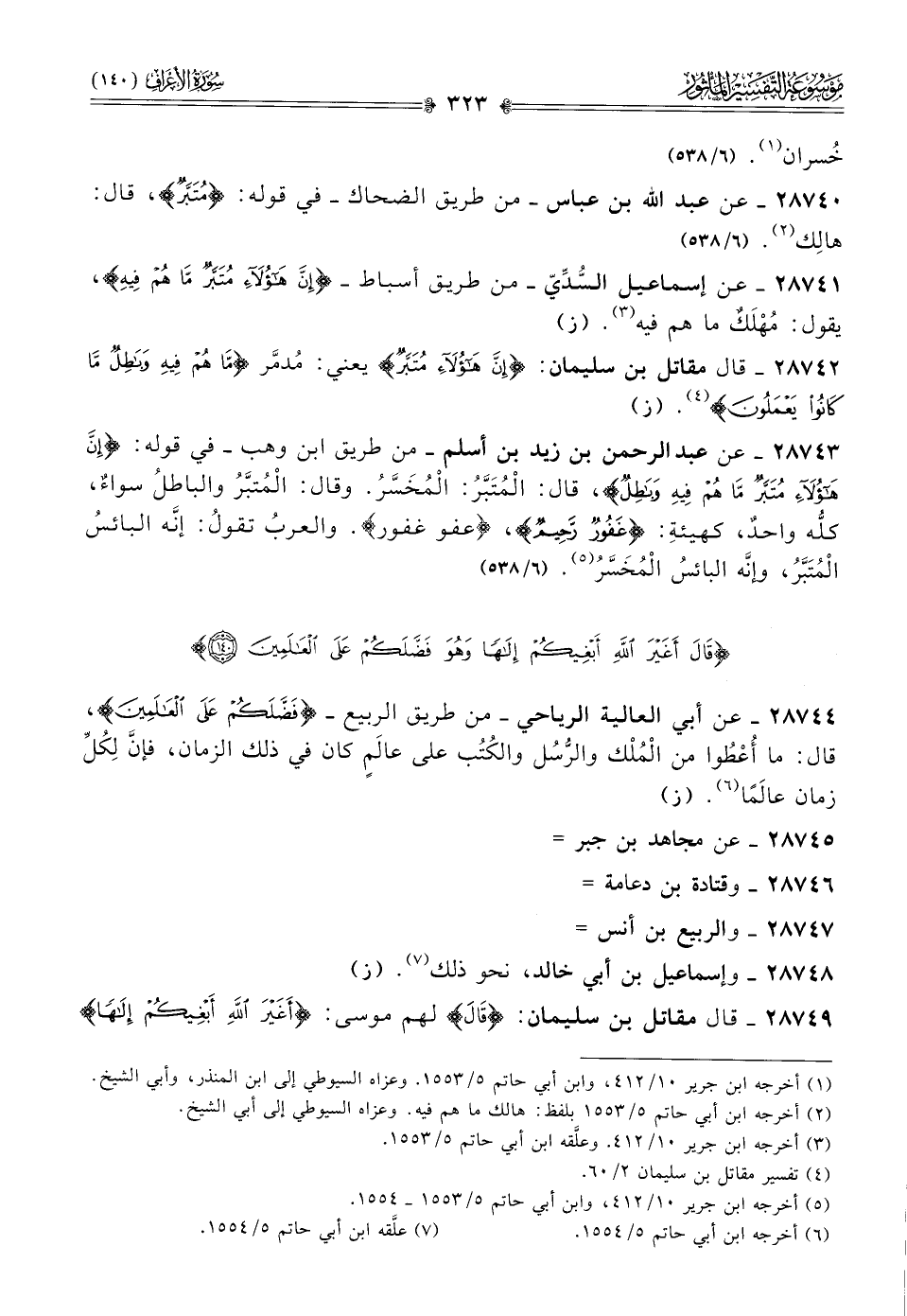 ٢٨٧٤١ - عن إسماعيل السُّدِّيّ -من طريق أسباط- {إن هؤلاء متبر ما هم فيه}، يقول: مُهْلَكٌ ما هم فيه (¬٣). (ز)