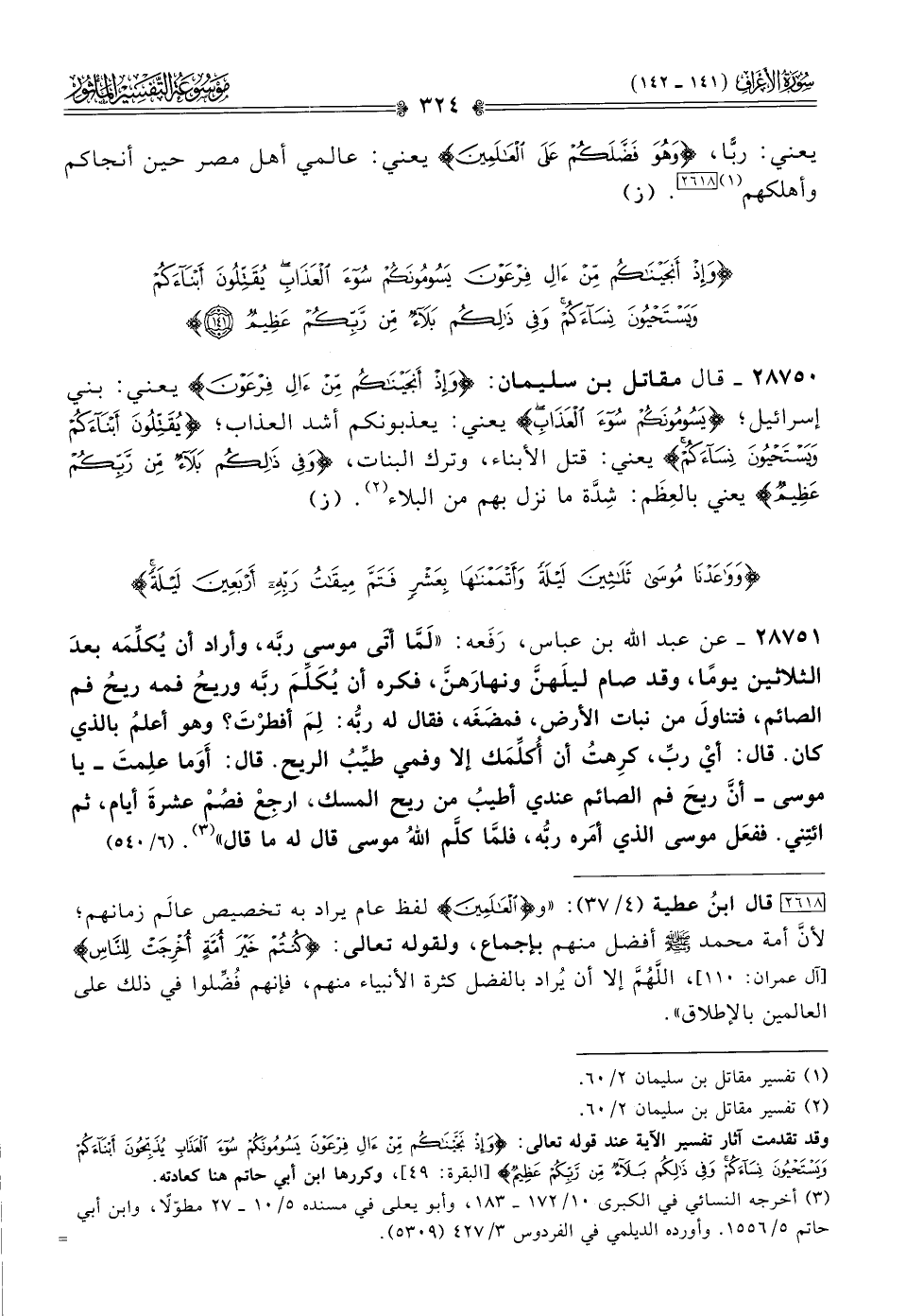 (¬٢) تفسير مقاتل بن سليمان ٢/ ٦٠.وقد تقدمت آثار تفسير الآية عند قوله تعالى: {وإذْ نَجَّيْناكُمْ مِن آلِ فِرْعَوْنَ يَسُومُونَكُمْ سُوءَ العَذابِ يُذَبِّحُونَ أبْناءَكُمْ ويَسْتَحْيُونَ نِساءَكُمْ وفِي ذَلِكُمْ بَلاءٌ مِن رَبِّكُمْ عَظِيمٌ (٤٩)} [البقرة: ٤٩]، وكررها ابن أبي حاتم هنا كعادته.