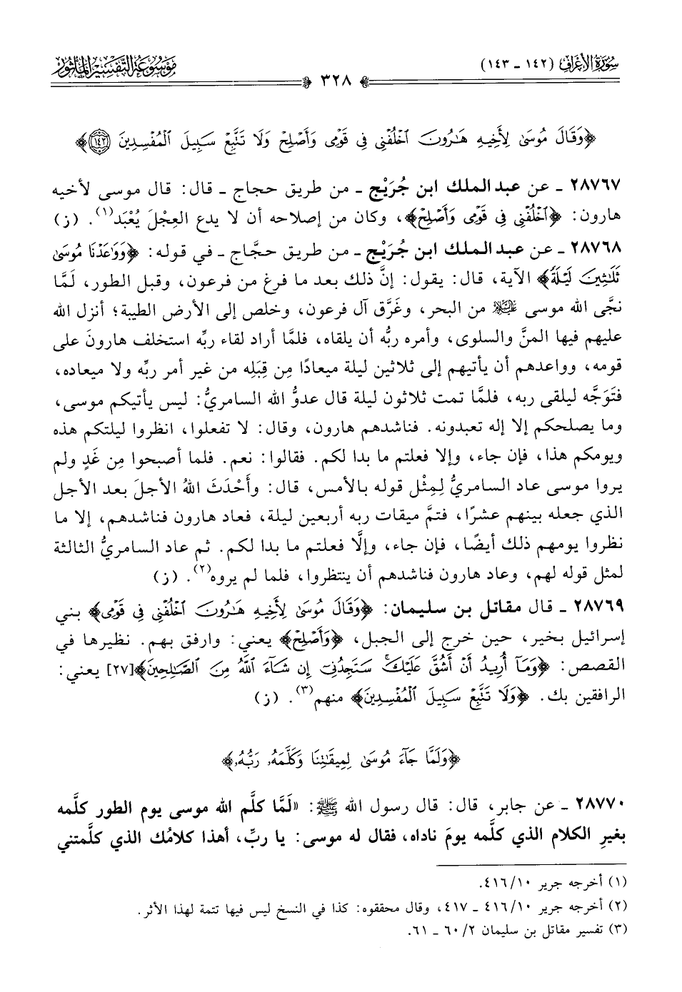 ٢٨٧٦٨ - عن عبد الملك ابن جُرَيْج -من طريق حجّاج- في قوله: {وواعدنا موسى ثلاثين ليلة} الآية، قال: يقول: إنّ ذلك بعد ما فرغ من فرعون، وقبل الطور، لَمّا نجّى الله موسى - عليه السلام - من البحر، وغَرَّق آل فرعون، وخلص إلى الأرض الطيبة؛ أنزل الله عليهم فيها المنَّ والسلوى، وأمره ربُّه أن يلقاه، فلمّا أراد لقاء ربِّه استخلف هارونَ على قومه، وواعدهم أن يأتيهم إلى ثلاثين ليلة ميعادًا مِن قِبَلِه من غير أمر ربِّه ولا ميعاده، فتَوَجَّه ليلقى ربه، فلمّا تمت ثلاثون ليلة قال عدوُّ الله السامريُّ: ليس يأتيكم موسى، وما يصلحكم إلا إله تعبدونه. فناشدهم هارون، وقال: لا تفعلوا، انظروا ليلتكم هذه ويومكم هذا، فإن جاء، وإلا فعلتم ما بدا لكم. فقالوا: نعم. فلما أصبحوا مِن غَدٍ ولم يروا موسى عاد السامريُّ لِمِثْل قوله بالأمس، قال: وأَحْدَثَ اللهُ الأجلَ بعد الأجل الذي جعله بينهم عشرًا، فتمَّ ميقات ربه أربعين ليلة، فعاد هارون فناشدهم، إلا ما نظروا يومهم ذلك أيضًا، فإن جاء، وإلّا فعلتم ما بدا لكم. ثم عاد السامريُّ الثالثة لمثل قوله لهم، وعاد هارون فناشدهم أن ينتظروا، فلما لم يروه (¬٢). (ز)