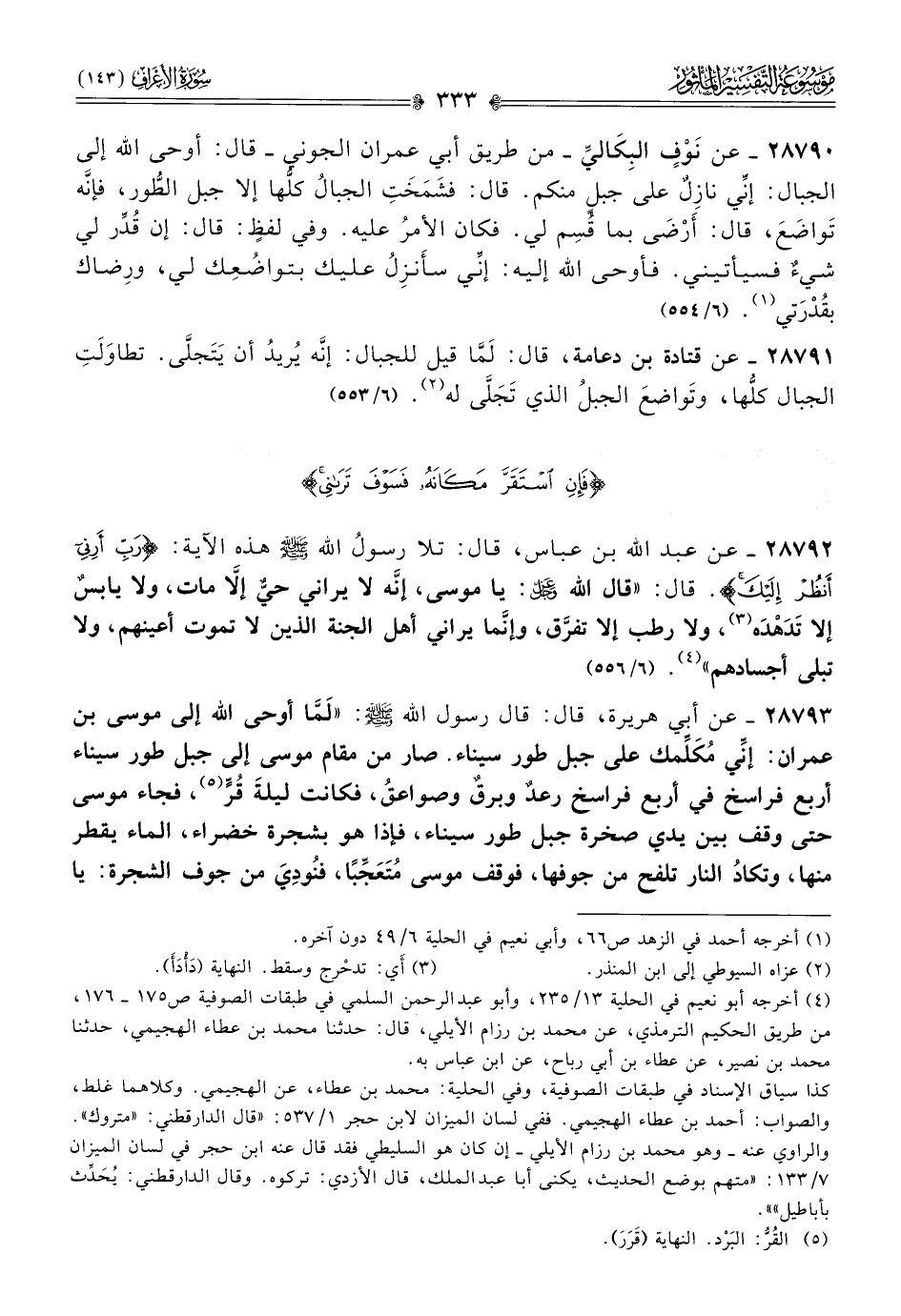 ٢٨٧٩٣ - عن أبي هريرة، قال: قال رسول الله - صلى الله عليه وسلم -: «لَمّا أوحى الله إلى موسى بن عمران: إنِّي مُكَلِّمك على جبل طور سيناء. صار من مقام موسى إلى جبل طور سيناء أربع فراسخ في أربع فراسخ رعدٌ وبرقٌ وصواعقُ، فكانت ليلةَ قُرٍّ (¬٥)، فجاء موسى حتى وقف بين يدي صخرة جبل طور سيناء، فإذا هو بشجرة خضراء، الماء يقطر منها، وتكادُ النار تلفح من جوفها، فوقف موسى مُتَعَجِّبًا، فنُودِيَ من جوف الشجرة: يا