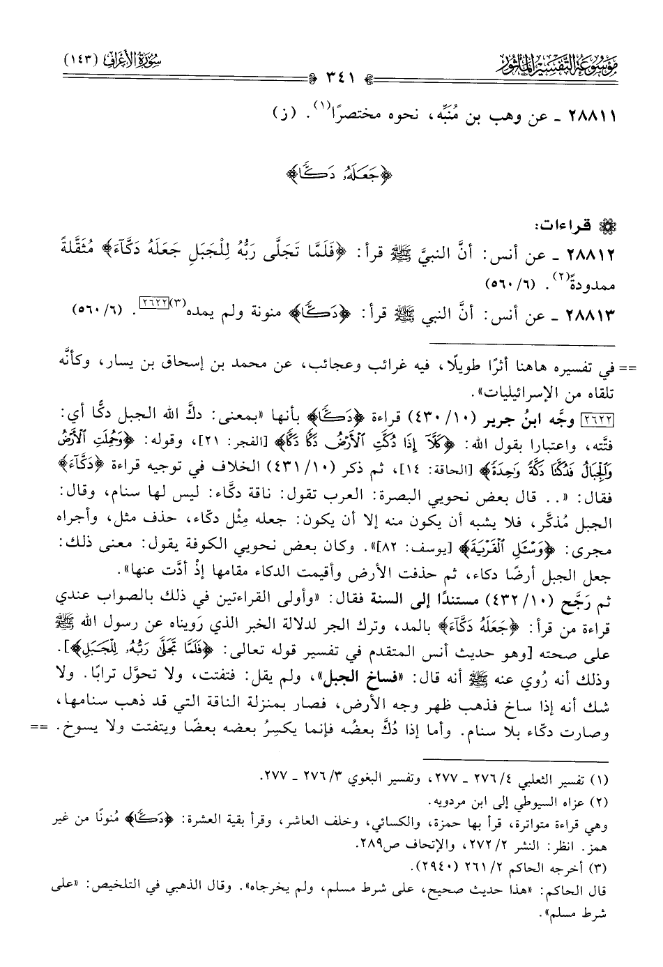 ثم رَجَّح (١٠/ ٤٣٢) مستندًا إلى السنة فقال: «وأولى القراءتين في ذلك بالصواب عندي قراءة من قرأ: «جَعَلَهُ دَكَّآءَ» بالمد، وترك الجر لدلالة الخبر الذي رَويناه عن رسول الله - صلى الله عليه وسلم - على صحته [وهو حديث أنس المتقدم في تفسير قوله تعالى: {فلما تجلى ربه للجبل}]. وذلك أنه رُوي عنه - صلى الله عليه وسلم - أنه قال: «فساخ الجبل»، ولم يقل: فتفتت، ولا تحوَّل ترابًا. ولا شك أنه إذا ساخ فذهب ظهر وجه الأرض، فصار بمنزلة الناقة التي قد ذهب سنامها، وصارت دكّاء بلا سنام. وأما إذا دُكَّ بعضُه فإنما يكسِرُ بعضه بعضًا ويتفتت ولا يسوخ. وأما الدكّاء فإنها خَلَفٌ من الأرض، فلذلك أُنِّثت على ما قد بيَّنتُ».