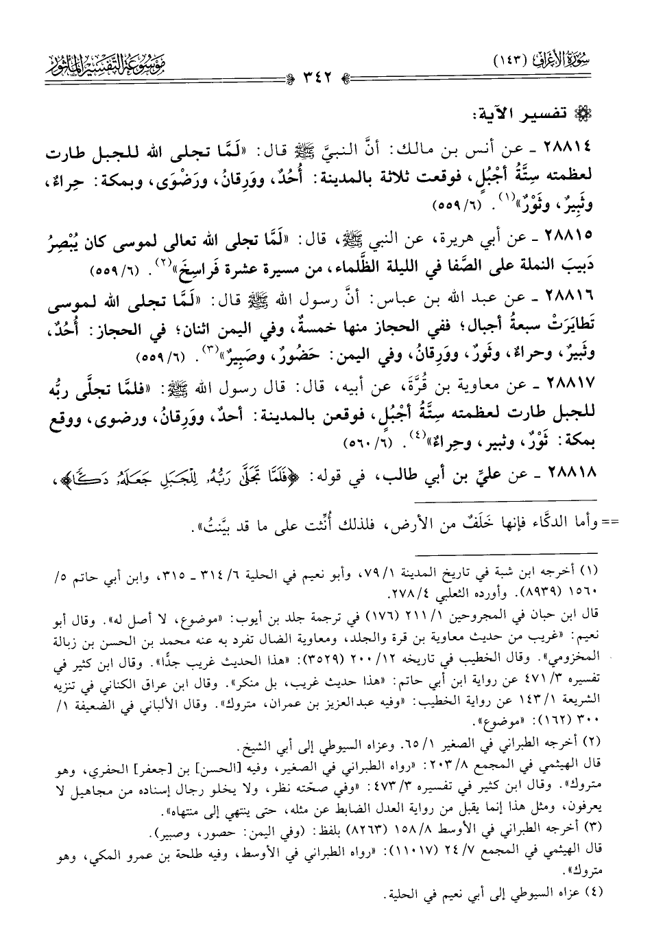 ٢٨٨١٦ - عن عبد الله بن عباس، أنّ رسول الله - صلى الله عليه وسلم - قال: «لَمّا تجلى الله لموسى تَطايَرَتْ سبعةُ أجبال؛ ففي الحجاز منها خمسةٌ، وفي اليمن اثنان؛ في الحجاز: أُحُدٌ، وثَبيرٌ، وحراءٌ، وثَورٌ، ووَرِقانُ، وفي اليمن: حَضُورٌ، وصَبِيرٌ» (¬٣). (٦/ ٥٥٩)