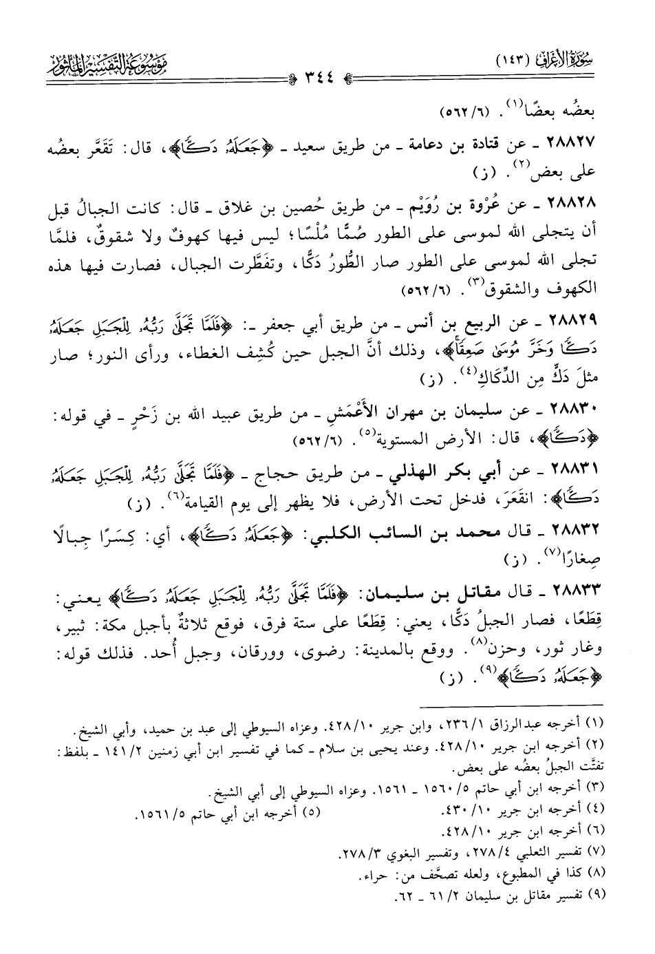٢٨٨٢٨ - عن عُرْوة بن رُوَيْم -من طريق حُصين بن غلاق- قال: كانت الجبالُ قبل أن يتجلى الله لموسى على الطور صُمًّا مُلْسًا؛ ليس فيها كهوفٌ ولا شقوقٌ، فلمّا تجلى الله لموسى على الطور صار الطُّورُ دَكًّا، وتفَطَّرت الجبال، فصارت فيها هذه الكهوف والشقوق (¬٣). (٦/ ٥٦٢)