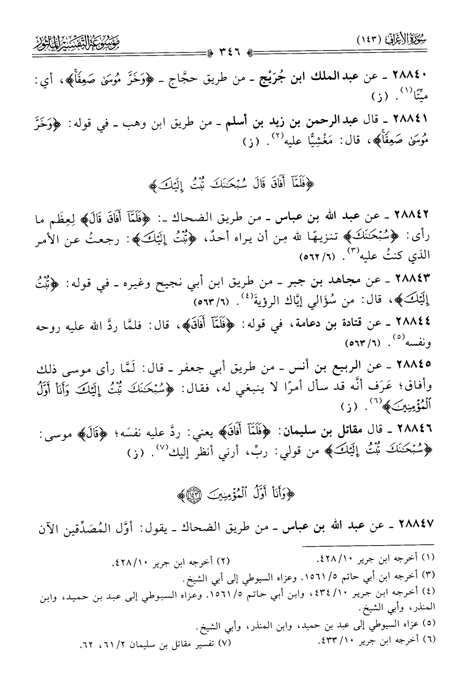 ٢٨٨٤٢ - عن عبد الله بن عباس -من طريق الضحاك-: {فلما أفاق قال} لِعِظَم ما رأى: {سبحانك} تنزيهًا لله مِن أن يراه أحدٌ، {تبت إليك}: رجعتُ عن الأمر الذي كنتُ عليه (¬٣). (٦/ ٥٦٢)