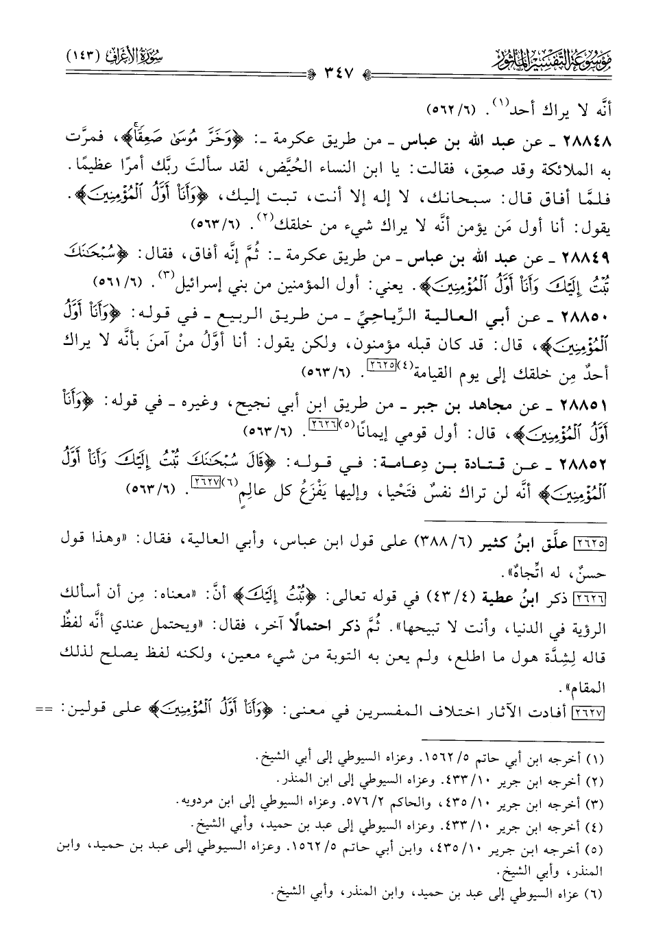 [٢٦٢٧] أفادت الآثار اختلاف المفسرين في معنى: {وأَنا أوَّلُ المُؤْمِنِينَ} على قولين: الأول: أول المؤمنين أنّك لن ترى في الدنيا. الثاني: أول المؤمنين بك من بني إسرائيل. الثالث: أول المؤمنين أنه لن تراك نفس فتحيا.