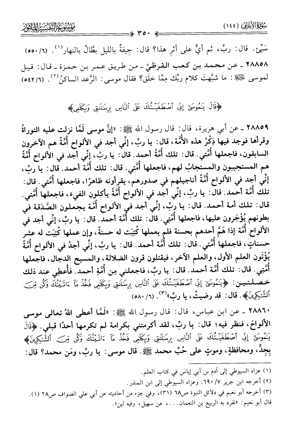 ٢٨٨٥٩ - عن أبي هريرة، قال: قال رسول الله - صلى الله عليه وسلم -: «إنّ موسى لَمّا نزلت عليه التوراةُ وقرأها فوجد فيها ذِكْرُ هذه الأُمَّة، قال: يا ربِّ، إنِّي أجد في الألواح أُمَّةً هم الآخرون السابقون، فاجعلها أُمَّتي. قال: تلك أُمَّةُ أحمد. قال: يا ربِّ، إنِّي أجد في الألواح أُمَّةً هم المستجيبون والمستجابُ لهم، فاجعلها أُمَّتي. قال: تلك أُمَّة أحمد. قال: يا ربِّ، إنِّي أجد في الألواح أُمَّةً أناجيلهم في صدورهم، يقرأونه ظاهرًا، فاجعلها أُمَّتي. قال: تلك أُمَّة أحمد. قال: يا ربِّ، إنِّي أجد في الألواح أُمَّةً يأكلون الفيءَ، فاجعلها أُمَّتي. قال: تلك أمة أحمد. قال: يا ربِّ، إنِّي أجد في الألواح أُمَّة يجعلون الصَّدَقة في بطونهم يُؤْجَرون عليها، فاجعلها أُمَّتِي. قال: تلك أُمَّة أحمد. قال: يا ربِّ، إنِّي أجد في الألواح أُمَّة إذا هَمَّ أحدهم بحسنة فلم يعملها كُتِبَت له حسنةً، وإن عملها كُتِبَت له عشر حسناتٍ، فاجعلها أُمَّتي. قال: تلك أُمَّة أحمد. قال: يا ربِّ، إنِّي أجدُ في الألواح أُمَّةً يُؤْتَون العلم الأول، والعلم الآخر، فيقتلون قرون الضلالة، والمسيح الدجال، فاجعلها أُمَّتِي. قال: تلك أُمَّة أحمد. قال: يا ربِّ، فاجعلني مِن أُمَّةِ أحمد. فأُعطِي عند ذلك خصلتين: {يا موسى إني اصطفيتك على الناس برسالاتي وبكلامي فخذ ما آتيتك وكن من الشاكرين}. قال: قد رضيتُ، يا ربِّ» (¬٣). (٦/ ٥٨٠)