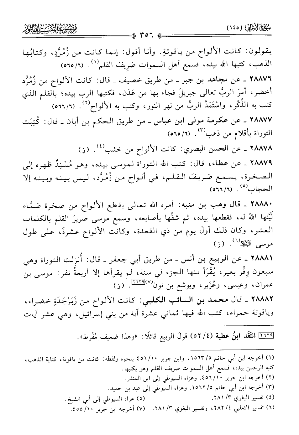 ٢٨٨٨٢ - قال محمد بن السائب الكلبي: كانت الألواح من زَبَرْجَدَةٍ خضراء، وياقوتة حمراء، كتب الله فيها ثماني عشرة آية من بني إسرائيل، وهي عشر آيات