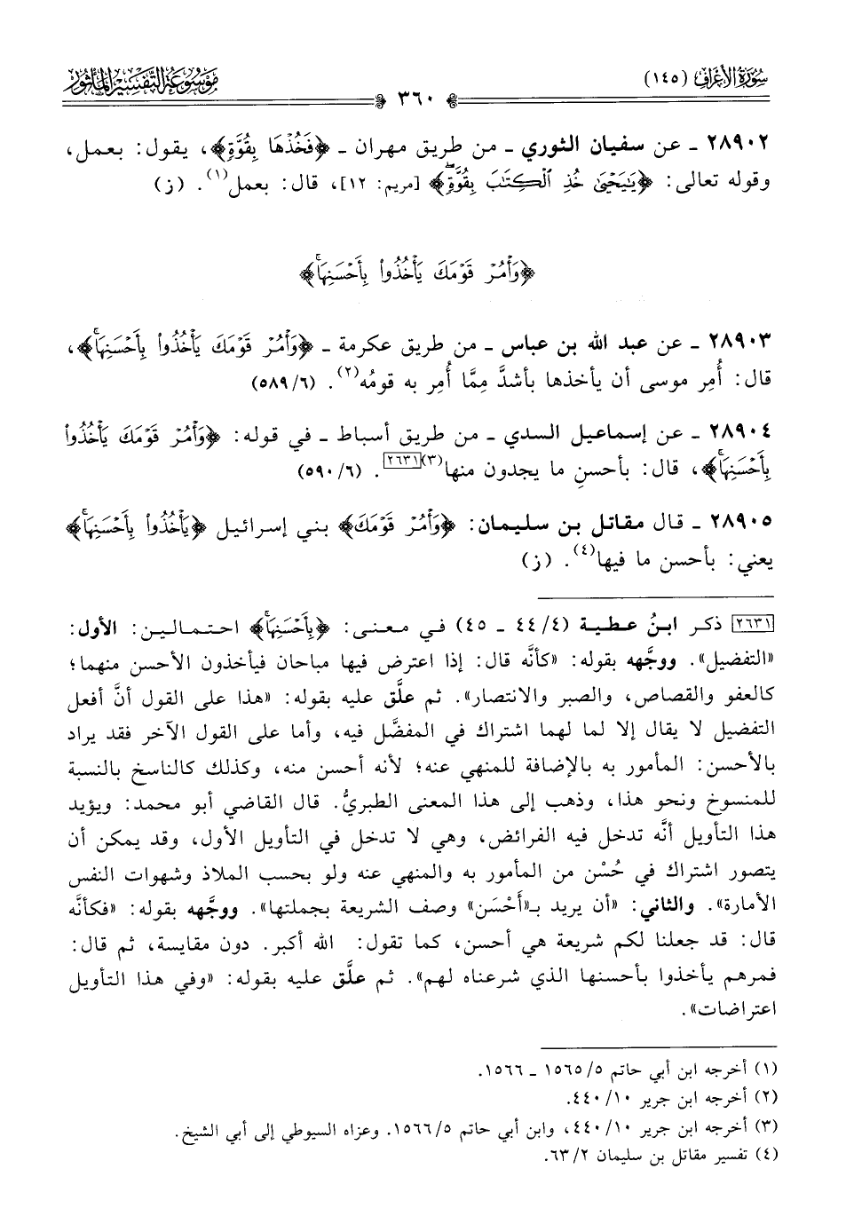 ٢٨٩٠٤ - عن إسماعيل السدي -من طريق أسباط- في قوله: {وأمر قومك يأخذوا بأحسنها}، قال: بأحسنِ ما يجدون منها (¬٣) [٢٦٣١]. (٦/ ٥٩٠)