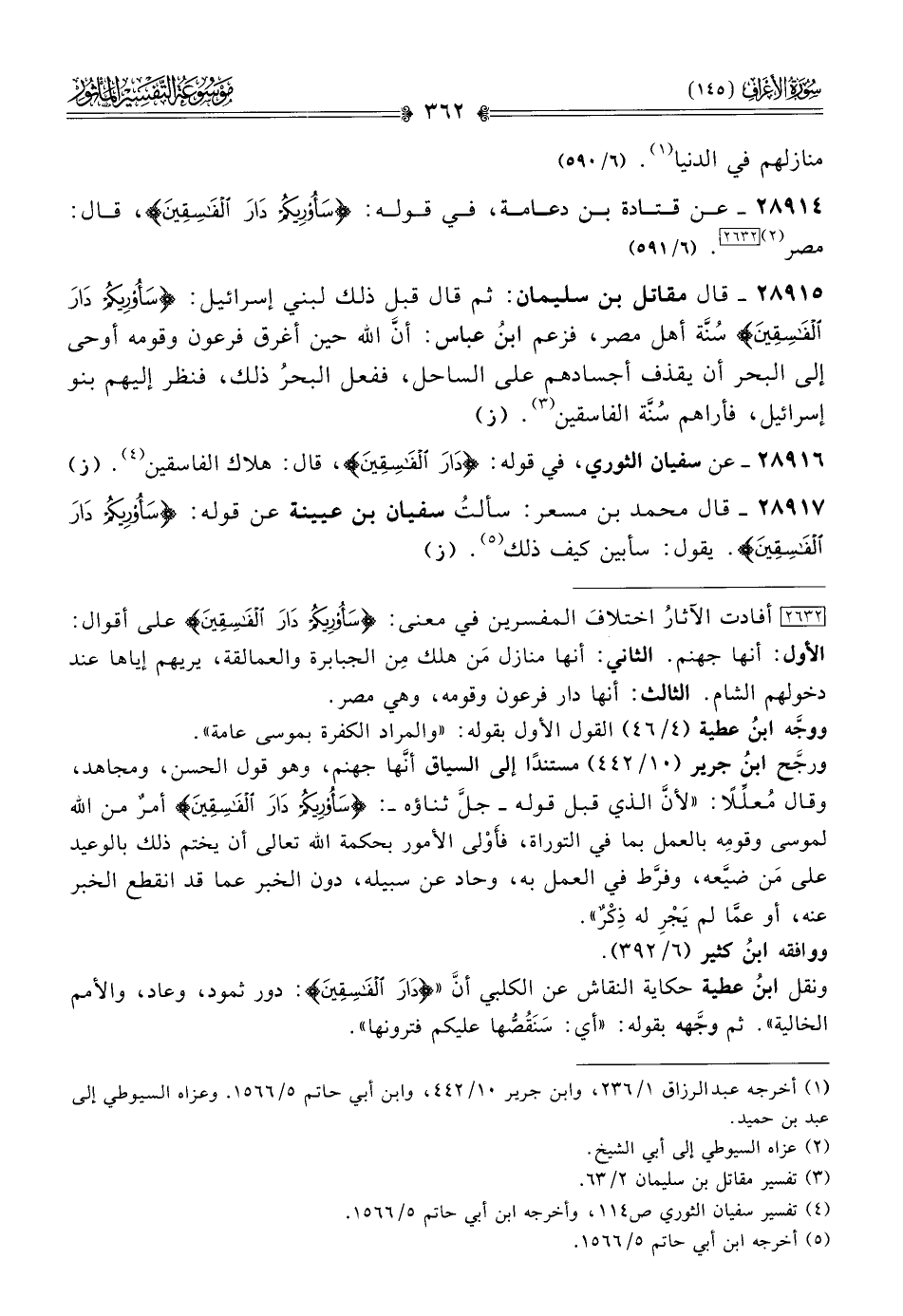 [٢٦٣٢] أفادت الآثارُ اختلافَ المفسرين في معنى: {سَأُرِيكُمْ دارَ الفاسِقِينَ} على أقوال: الأول: أنها جهنم. الثاني: أنها منازل مَن هلك مِن الجبابرة والعمالقة، يريهم إياها عند دخولهم الشام. الثالث: أنها دار فرعون وقومه، وهي مصر.