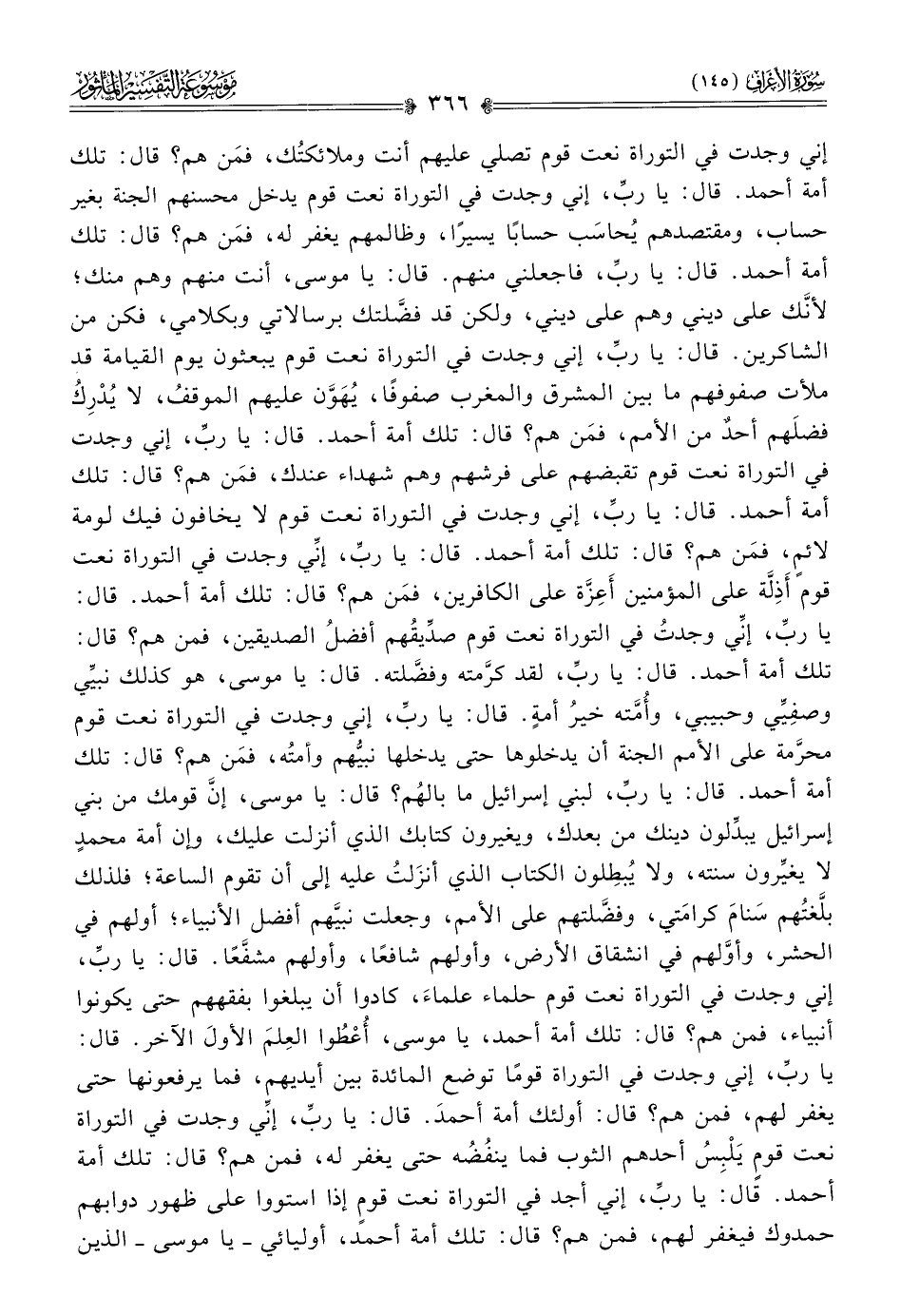 إني وجدت في التوراة نعت قوم تصلي عليهم أنت وملائكتُك، فمَن هم؟ قال: تلك أمة أحمد. قال: يا ربِّ، إني وجدت في التوراة نعت قوم يدخل محسنهم الجنة بغير حساب، ومقتصدهم يُحاسَب حسابًا يسيرًا، وظالمهم يغفر له، فمَن هم؟ قال: تلك أمة أحمد. قال: يا ربِّ، فاجعلني منهم. قال: يا موسى، أنت منهم وهم منك؛ لأنّك على ديني وهم على ديني، ولكن قد فضَّلتك برسالاتي وبكلامي، فكن من الشاكرين. قال: يا ربِّ، إني وجدت في التوراة نعت قوم يبعثون يوم القيامة قد ملأت صفوفهم ما بين المشرق والمغرب صفوفًا، يُهَوَّن عليهم الموقفُ، لا يُدْرِكُ فضلَهم أحدٌ من الأمم، فمَن هم؟ قال: تلك أمة أحمد. قال: يا ربِّ، إني وجدت في التوراة نعت قوم تقبضهم على فرشهم وهم شهداء عندك، فمَن هم؟ قال: تلك أمة أحمد. قال: يا ربِّ، إني وجدت في التوراة نعت قوم لا يخافون فيك لومة لائمٍ، فمَن هم؟ قال: تلك أمة أحمد. قال: يا ربِّ، إنِّي وجدت في التوراة نعت قوم أذِلَّة على المؤمنين أعِزَّة على الكافرين، فمَن هم؟ قال: تلك أمة أحمد. قال: يا ربِّ، إنِّي وجدتُ في التوراة نعت قوم صدِّيقُهم أفضلُ الصديقين، فمن هم؟ قال: تلك أمة أحمد. قال: يا ربِّ، لقد كرَّمته وفضَّلته. قال: يا موسى، هو كذلك نبيِّي وصفِيِّي وحبيبي، وأُمَّته خيرُ أمةٍ. قال: يا ربِّ، إني وجدت في التوراة نعت قوم محرَّمة على الأمم الجنة أن يدخلوها حتى يدخلها نبيُّهم وأمتُه، فمَن هم؟ قال: تلك أمة أحمد. قال: يا ربِّ، لبني إسرائيل ما بالهُم؟ قال: يا موسى، إنّ قومك من بني إسرائيل يبدِّلون دينك من بعدك، ويغيرون كتابك الذي أنزلت عليك، وإن أمة محمدٍ لا يغيِّرون سنته، ولا يُبطِلون الكتاب الذي أنزَلتُ عليه إلى أن تقوم الساعة؛ فلذلك بلَّغتُهم سَنامَ كرامَتي، وفضَّلتهم على الأمم، وجعلت نبيَّهم أفضل الأنبياء؛ أولهم في الحشر، وأوَّلهم في انشقاق الأرض، وأولهم شافعًا، وأولهم مشفَّعًا. قال: يا ربِّ، إني وجدت في التوراة نعت قوم حلماء علماءَ، كادوا أن يبلغوا بفقههم حتى يكونوا أنبياء، فمن هم؟ قال: تلك أمة أحمد، يا موسى، أُعْطُوا العِلمَ الأولَ الآخر. قال: يا ربِّ، إني وجدت في التوراة قومًا توضع المائدة بين أيديهم، فما يرفعونها حتى يغفر لهم، فمن هم؟ قال: أولئك أمة أحمدَ. قال: يا ربِّ، إنِّي وجدت في التوراة نعت قومٍ يَلْبِسُ أحدهم الثوب فما ينفُضُه حتى يغفر له، فمن هم؟ قال: تلك أمة أحمد. قال: يا ربِّ، إني أجد في التوراة نعت قومٍ إذا استووا على ظهور دوابهم حمدوك فيغفر لهم، فمن هم؟ قال: تلك أمة أحمد، أوليائي -يا موسى- الذين