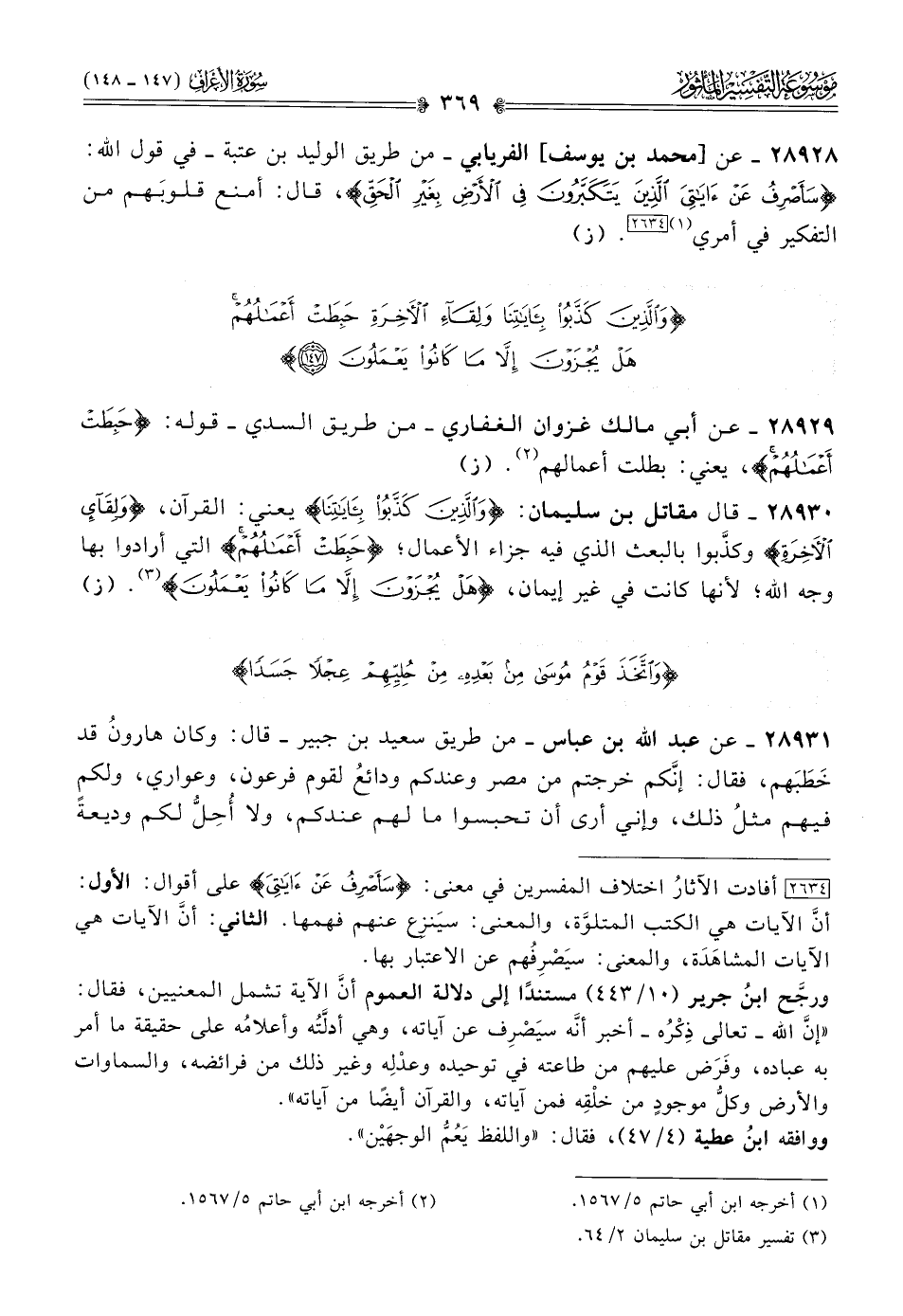 [٢٦٣٤] أفادت الآثارُ اختلاف المفسرين في معنى: {سَأَصْرِفُ عَنْ آياتِيَ} على أقوال: الأول: أنّ الآيات هي الكتب المتلوَّة، والمعنى: سيَنزِع عنهم فهمها. الثاني: أنّ الآيات هي الآيات المشاهَدَة، والمعنى: سيَصْرِفُهم عن الاعتبار بها.