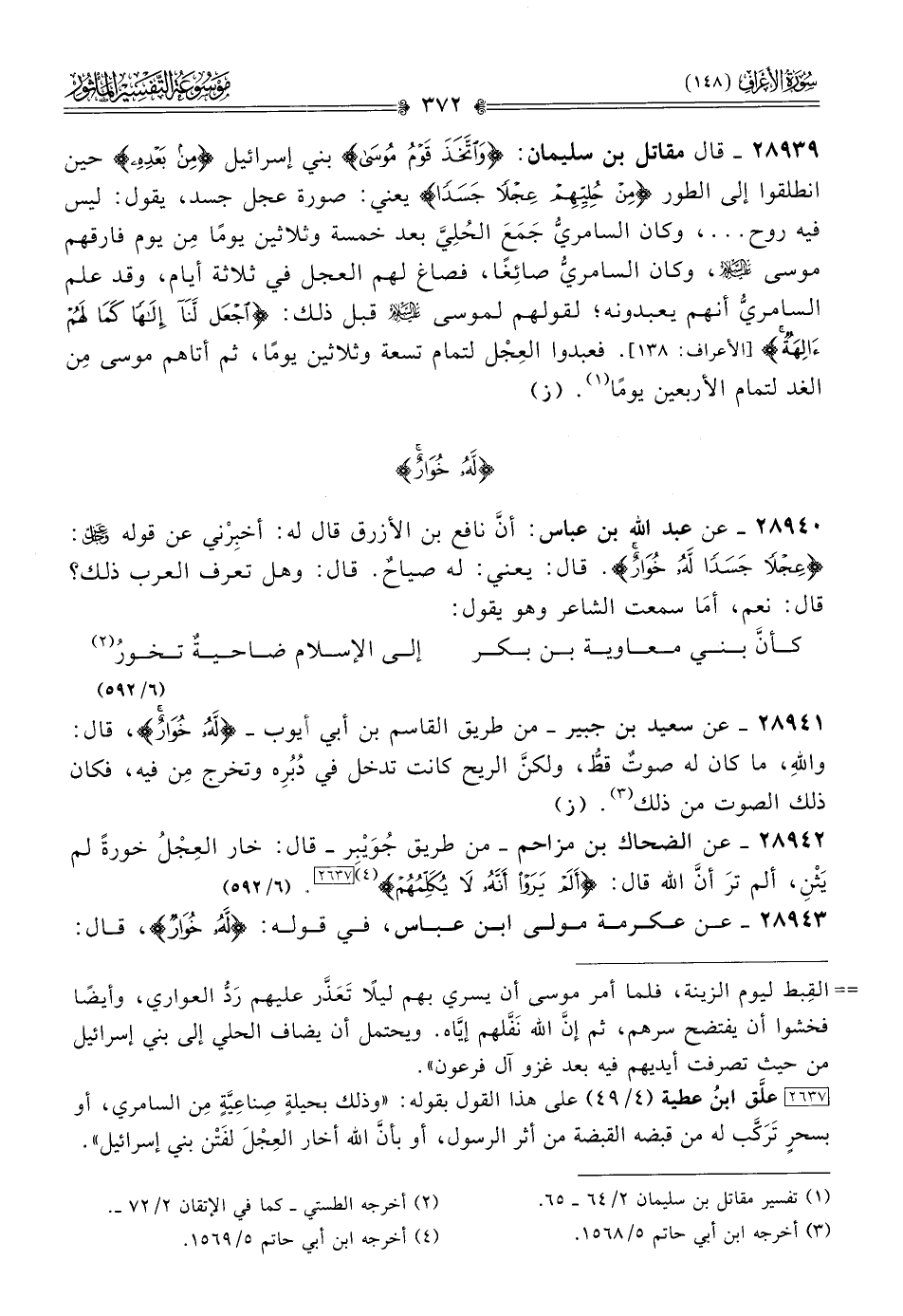 ٢٨٩٤٢ - عن الضحاك بن مزاحم -من طريق جُوَيْبِر- قال: خار العِجْلُ خورةً لم يَثْنِ، ألم ترَ أنّ الله قال: {ألم يروا أنه لا يكلمهم} (¬٤) [٢٦٣٧]. (٦/ ٥٩٢)