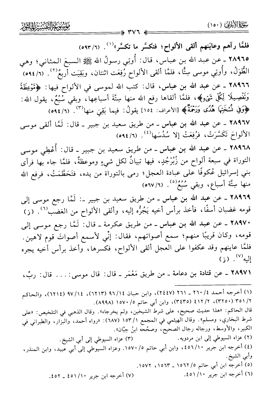 ٢٨٩٦٩ - عن عبد الله بن عباس -من طريق سعيد بن جبير-: لَمّا رجع موسى إلى قومه عضبان أسفًا، فأخذ برأس أخيه يَجُرُّه إليه، وألقى الألواح من الغضب (¬٦). (ز)