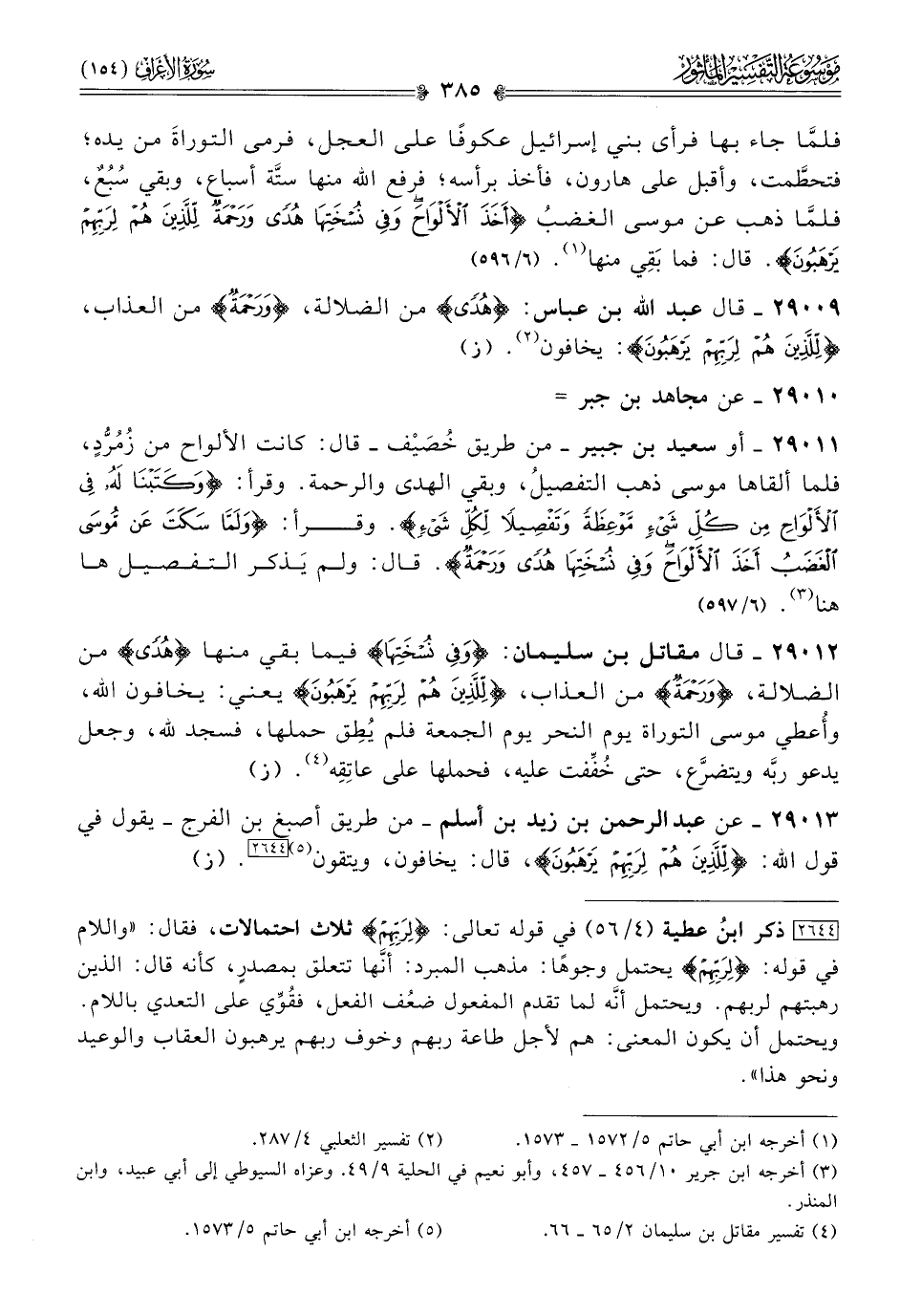 ٢٩٠٠٩ - قال عبد الله بن عباس: {هُدًى} من الضلالة، {ورَحْمَةٌ} من العذاب، {لِلَّذِينَ هُمْ لِرَبِّهِمْ يَرْهَبُونَ}: يخافون (¬٢). (ز)