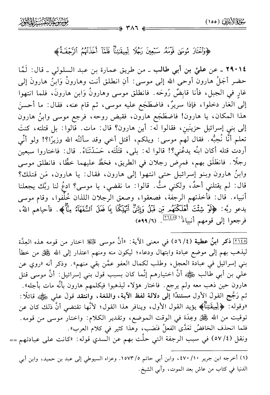 [٢٦٤٥] ذكر ابنُ عطية (٤/ ٥٦) في معنى الآية: «أنّ موسى - عليه السلام - اختار من قومه هذه العِدَّة ليذهب بهم إلى موضع عبادة وابتهال ودعاء؛ ليكون منه ومنهم اعتذار إلى الله - عز وجل - من خطأ بني إسرائيل في عبادة العجل، وطلب لكمال العفو عمَّن بقي منهم». وذكر أنه «روي عن علي بن أبي طالب - رضي الله عنهما - أنّ اختيارهم إنّما كان بسبب قول بني إسرائيل: أنّ موسى قتل هارون حين ذهب معه ولم يرجع. فاختار هؤلاء ليذهبوا فيكلمهم هارون بأنّه مات بأجله».