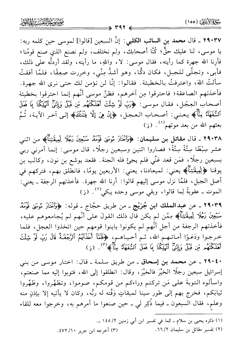 ٢٩٠٣٩ - عن عبد الملك ابن جُرَيْج -من طريق حجّاج- قوله: {واختار موسى قومه سبعين رجلا لميقاتنا} مِمَّن لم يكن قال ذلك القولَ على أنّهم لم يُجامعوهم عليه، فأخذتهم الرجفة من أجل أنّهم لم يكونوا باينوا قومهم حين اتخذوا العجل، فلما خرجوا ودَعَوْا أماتهم الله، ثم أحياهم، {فلما أخذتهم الرجفة قال رب لو شئت أهلكتهم من قبل وإياي أتهلكنا بما فعل السفهاء منا} (¬٣). (ز)