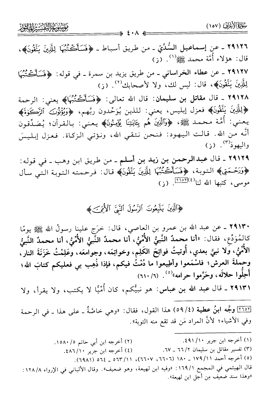 ٢٩١٢٦ - عن إسماعيل السُّدِّيّ -من طريق أسباط- {فَسَأَكْتُبُها لِلَّذِينَ يَتَّقُونَ}، قال: هؤلاء أُمَّة محمد - صلى الله عليه وسلم - (¬١). (ز)