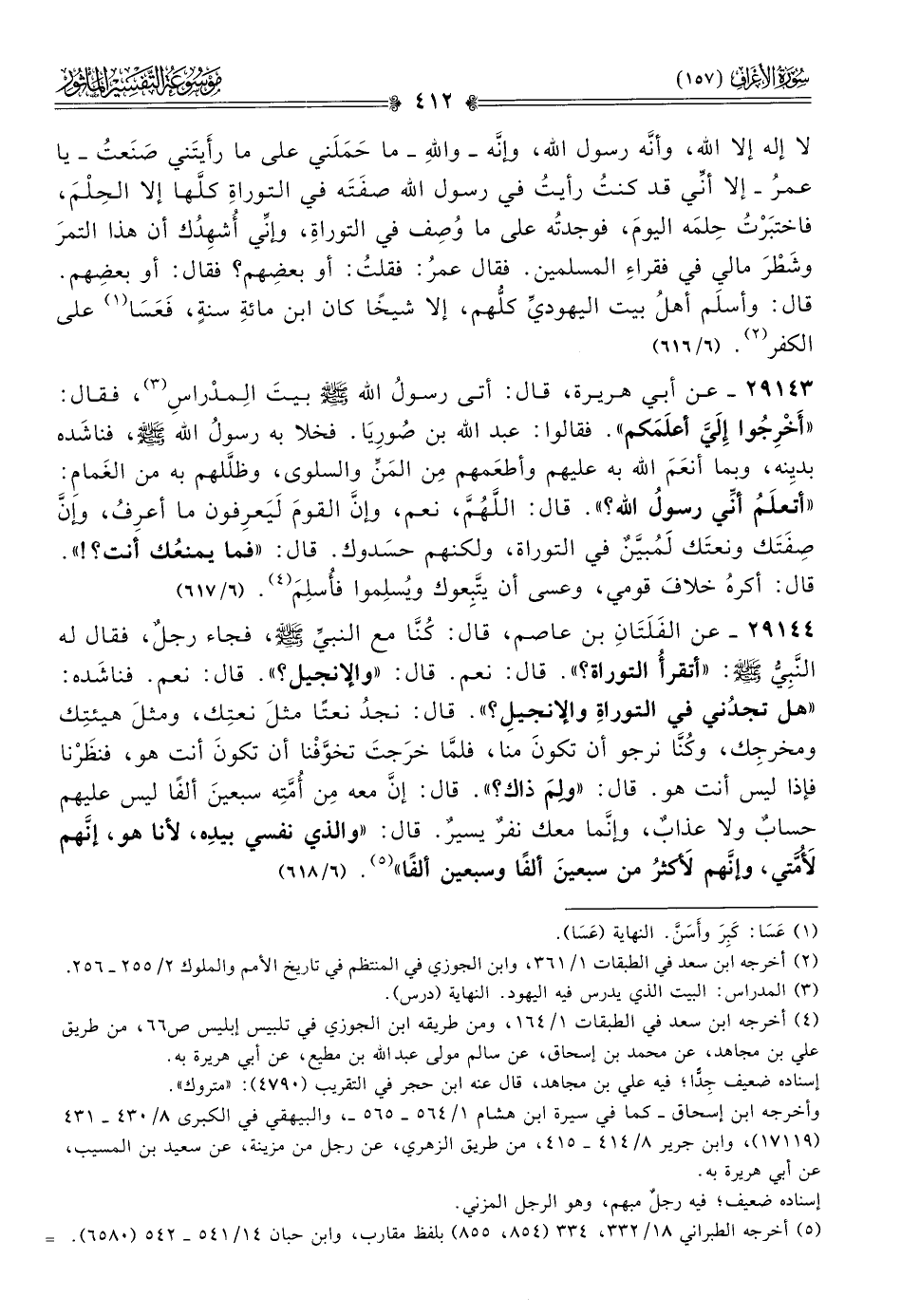 ٢٩١٤٣ - عن أبي هريرة، قال: أتى رسولُ الله - صلى الله عليه وسلم - بيتَ الِمدْراسِ (¬٣)، فقال: «أخْرِجُوا إلَيَّ أعلَمَكم». فقالوا: عبد الله بن صُورِيا. فخلا به رسولُ الله - صلى الله عليه وسلم -، فناشَده بديِنه، وبما أنعَمَ الله به عليهم وأطعَمهم مِن المَنِّ والسلوى، وظلَّلهم به من الغَمامِ: «أتعلَمُ أنِّي رسولُ الله؟». قال: اللَّهُمَّ، نعم، وإنّ القومَ لَيَعرِفون ما أعرِفُ، وإنّ صِفَتَك ونعتَك لَمُبيَّنٌ في التوراة، ولكنهم حسَدوك. قال: «فما يمنعُك أنت؟!». قال: أكرهُ خلافَ قومي، وعسى أن يتَّبِعوك ويُسلِموا فأُسلِمَ (¬٤). (٦/ ٦١٧)