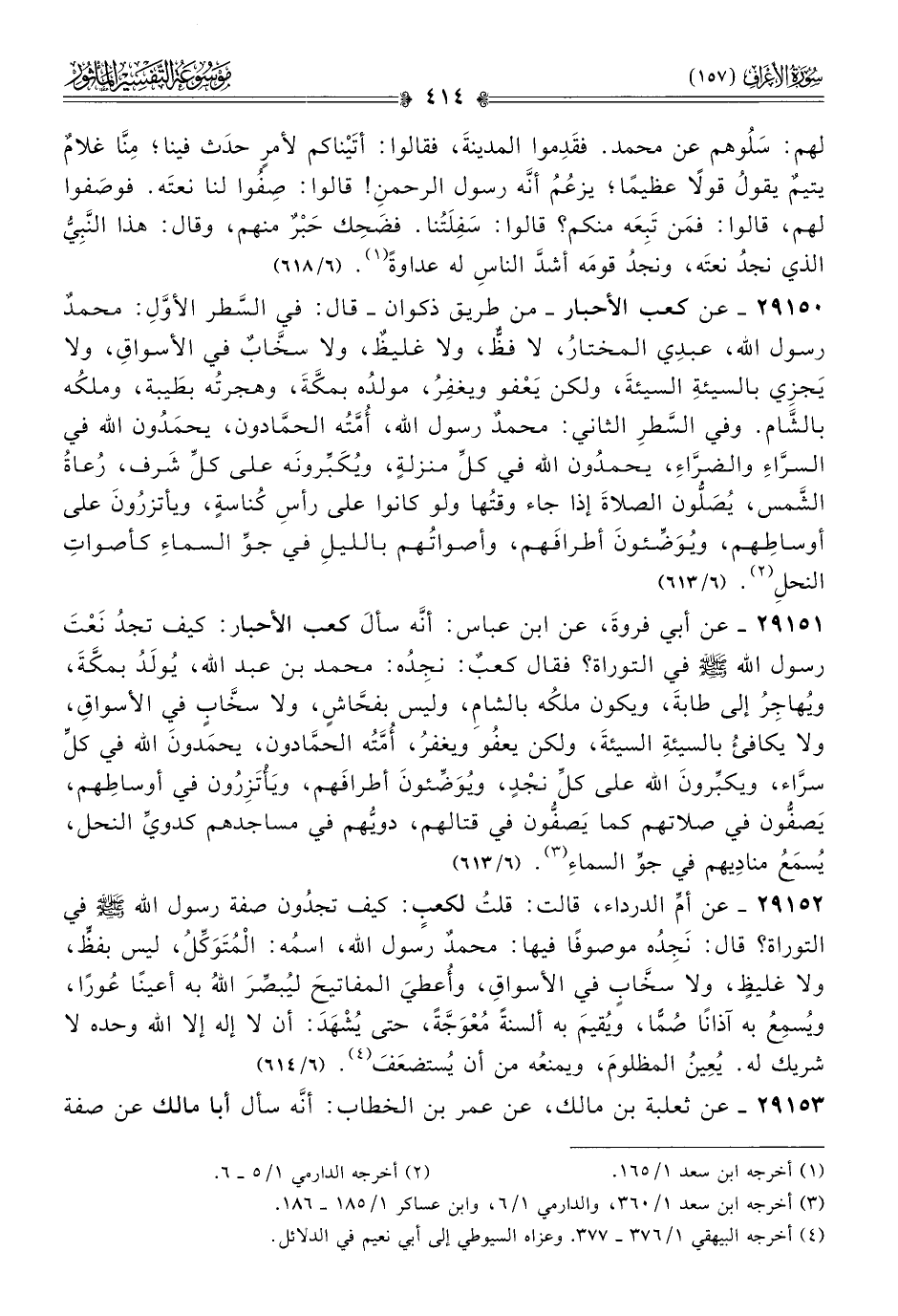 ٢٩١٥١ - عن أبي فروةَ، عن ابن عباس، أنّه سألَ كعب الأحبار: كيف تجدُ نَعْتَ رسول الله - صلى الله عليه وسلم - في التوراة؟ فقال كعبٌ: نجِدُه: محمد بن عبد الله، يُولَدُ بمكَّةَ، ويُهاجِرُ إلى طابةَ، ويكون ملكُه بالشامِ، وليس بفحّاشٍ، ولا سخّابٍ في الأسواقِ، ولا يكافئُ بالسيئةِ السيئةَ، ولكن يعفُو ويغفرُ، أُمَّتُه الحمّادون، يحمَدونَ الله في كلِّ سرّاء، ويكبِّرونَ الله على كلِّ نجْدٍ، ويُوَضِّئونَ أطرافَهم، ويَأْتَزِرُون في أوساطِهم، يَصفُّون في صلاتهم كما يَصفُّون في قتالهم، دويُّهم في مساجدهم كدويِّ النحل، يُسمَعُ منادِيهم في جوِّ السماءِ (¬٣). (٦/ ٦١٣)