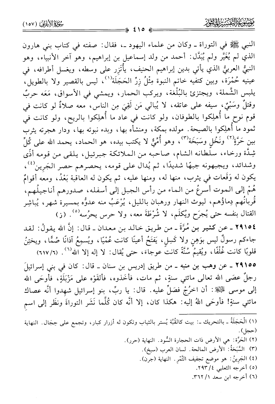 النبي - صلى الله عليه وسلم - في التوراة -وكان من علماء اليهود-، فقال: صفته في كتاب بني هارون الذي لم يُغَيَّر ولم يُبَدَّل: أحد من ولد إسماعيل بن إبراهيم، ومن آخر الأنبياء، وهو النبيُّ العربيُّ الذي يأتي بدين إبراهيم الحنيف، يأْتَزِر على وسطه، ويغسل أطرافه، في عينيه حُمْرَة، وبين كتفيه خاتم النبوة مِثْلُ زِرِّ الحَجَلَة (¬١)، ليس بالقصير ولا بالطويل، يلبس الشَّملة، ويجري بالبغلة، ويركب الحمار، ويمشي في الأسواق، مَعَه حربٌ وقتلٌ وسَبْيٌ، سيفه على عاتقه، لا يُبالي مَن لَقِيَ مِن الناس، معه صلاةٌ لو كانت في قوم نوح ما أُهلِكوا بالطوفان، ولو كانت في عاد ما أُهلِكوا بالريح، ولو كانت في ثمود ما أُهلِكوا بالصيحة. مولده بمكة، ومنشأه بها، وبدء نبوته بها، ودار هجرته يثرب بين حَرَّةٍ (¬٢) ونَخْلٍ وسَبَخَة (¬٣)، وهو أُمِّيٌّ لا يكتب بيده، هو بجهاد، يحمد الله على كُلِّ شِدَّة ورخاء، سلطانه الشام، صاحبه من الملائكة جبرئيل، يلقى من قومه أذًى شديدًا، ويجبهونه جبهًا شديدًا، ثم يُدال على قومه، يحصرهم حصر الجَرِين (¬٤)، يكون له وقَعات في يثرب، منها له، ومنها عليه، ثم يكون له العاقبة بَعْدُ، ومعه أقوامٌ هُمْ إلى الموت أسرعُ من الماء من رأس الجبل إلى أسفله، صدورهم أناجيلُهم، قُربانُهم دِماؤُهم، ليوث النهار ورهبان بالليل، يُرْعَبُ منه عدوُّه بمسيرة شهر، يُباشِر القتال بنفسه حتى يُجرَح ويُكلَم، لا شُرْطَةَ معه، ولا حرس يحرُسه (¬٥). (ز)