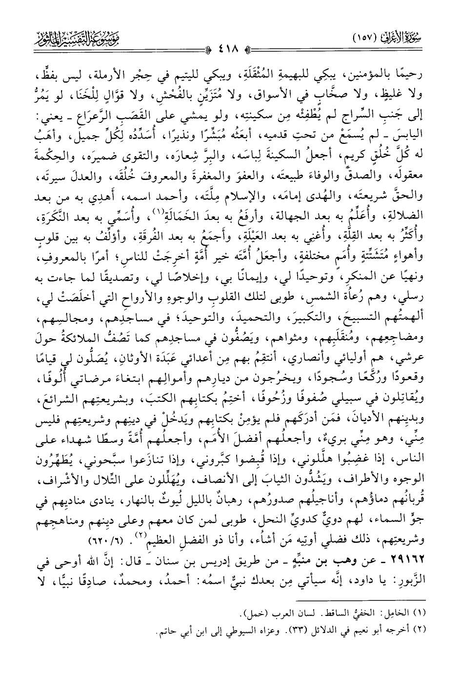 رحيمًا بالمؤمنين، يبكِي للبهيمةِ المُثْقَلَةِ، ويبكي لليتيم في حِجْر الأرملة، ليس بفظٍّ، ولا غليظٍ، ولا صخّابٍ في الأسواق، ولا مُتَزَيِّنٍ بالفُحْشِ، ولا قوّالٍ لِلْخَنا، لو يَمُرُّ إلى جَنبِ السِّراج لم يُطْفِئْه مِن سكينتِه، ولو يمشي على القَصَبِ الرَّعراعِ -يعني: اليابسَ- لم يُسمَعْ من تحتِ قدميه، أبعَثُه مُبَشِّرًا ونذيرًا، أُسَدِّدُه لِكُلِّ جميل، وأهَبُ له كُلَّ خُلُقٍ كريمٍ، أجعلُ السكينةَ لِباسَه، والبِرَّ شِعارَه، والتقوى ضميرَه، والحِكْمةَ معقولَه، والصدقَ والوفاءَ طبيعتَه، والعفوَ والمغفرةَ والمعروفَ خُلُقَه، والعدلَ سيرتَه، والحقَّ شريعتَه، والهُدى إمامَه، والإسلام مِلَّتَه، وأحمد اسمه، أهدِي به من بعد الضلالةِ، وأُعَلِّمُ به بعد الجهالة، وأرفَعُ به بعدَ الخَمالَةِ (¬١)، وأُسَمِّي به بعد النَّكَرَةِ، وأُكَثِّرُ به بعد القِلَّةِ، وأُغنِي به بعد العَيْلَةِ، وأَجمَعُ به بعد الفُرقَةِ، وأؤلِّفُ به بين قلوبٍ وأهواءٍ مُتَشَتِّتةٍ وأُمَمٍ مختلفةٍ، وأجعَلُ أُمَّتَه خير أُمَّةٍ أخرِجَتْ للناسِ؛ أمرًا بالمعروفِ، ونهيًا عن المنكرِ، وتوحيدًا لي، وإيمانًا بي، وإخلاصًا لي، وتصديقًا لما جاءت به رسلي، وهم رُعاُة الشمسِ، طوبى لتلك القلوبِ والوجوهِ والأرواحِ التي أخلَصَتْ لي، ألهمتُهم التسبيحَ، والتكبيرَ، والتحميدَ، والتوحيدَ؛ في مساجدِهم، ومجالسِهم، ومضاجِعِهم، ومُنقَلَبِهم، ومثواهم، ويَصُفُّون في مساجدِهم كما تَصُفُّ الملائكةُ حولَ عرشي، هم أوليائي وأنصاري، أنتقِمُ بهم مِن أعدائي عَبَدَة الأوثانِ، يُصَلُّون لي قيامًا وقعودًا ورُكَّعًا وسُجودًا، ويخرُجون من ديارِهم وأموالِهم ابتغاءَ مرضاتي أُلُوفًا، ويُقاتِلون في سبيلي صُفوفًا وزُحُوفًا، أختِمُ بكتابِهم الكتبَ، وبشريعتِهم الشرائعَ، وبديِنهم الأديانَ، فمَن أدرَكَهم فلم يؤمِن بكتابِهم ويَدخُلْ في دينِهم وشريعتِهم فليس مِنِّي، وهو مِنِّي بريءٌ، وأجعلُهم أفضلَ الأُمَم، وأجعلُهم أُمَّةً وسطًا شهداء على الناس، إذا غضِبُوا هلَّلوني، وإذا قُبِضوا كبَّروني، وإذا تنازَعوا سبَّحوني، يُطَهِّرُون الوجوه والأطراف، ويَشُدُّون الثيابَ إلى الأنصاف، ويُهَلِّلون على التِّلال والأشْراف، قُربانُهم دماؤُهم، وأناجيلُهم صدورُهم، رهبانٌ بالليل لُيوثٌ بالنهار، ينادى مناديِهم في جوٍّ السماء، لهم دويٌّ كدويِّ النحل، طوبى لمن كان معهم وعلى ديِنهم ومناهجِهم وشريعتِهم، ذلك فضلي أوتِيه مَن أشاُء، وأنا ذو الفضلِ العظيمِ (¬٢). (٦/ ٦٢٠)