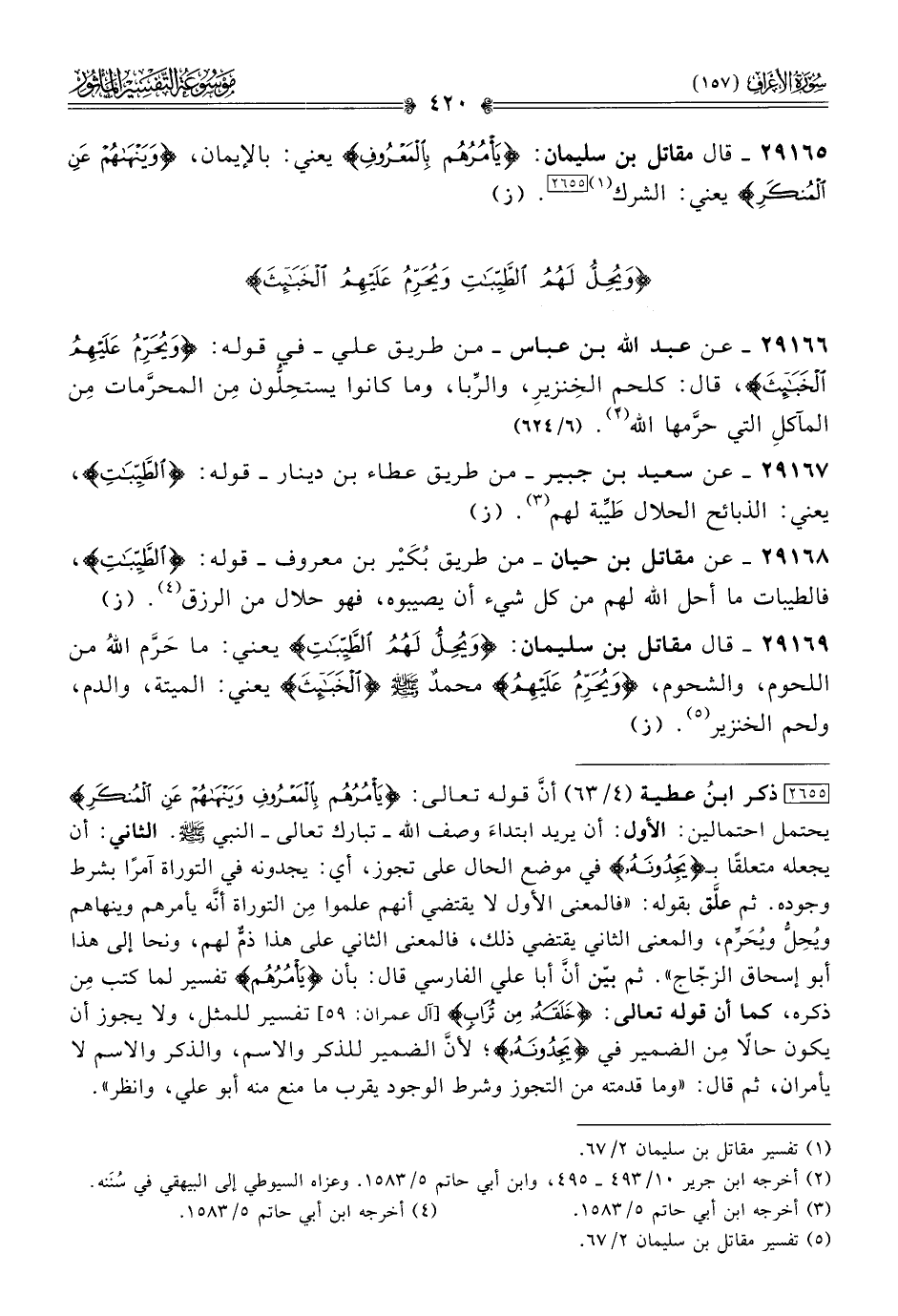 ٢٩١٦٩ - قال مقاتل بن سليمان: {ويُحِلُّ لَهُمُ الطَّيِّباتِ} يعني: ما حَرَّم اللهُ من اللحوم، والشحوم، {ويُحَرِّمُ عَلَيْهِمُ} محمدٌ - صلى الله عليه وسلم - {الخَبائِثَ} يعني: الميتة، والدم، ولحم الخنزير (¬٥). (ز)