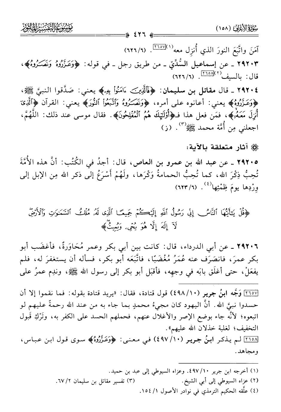 ٢٩٢٠٣ - عن إسماعيل السُّدِّيّ -من طريق رجل- في قوله: {وعَزَّرُوهُ ونَصَرُوهُ}، قال: بالسيف (¬٢) [٢٦٥٨]. (٦/ ٦٢٦)