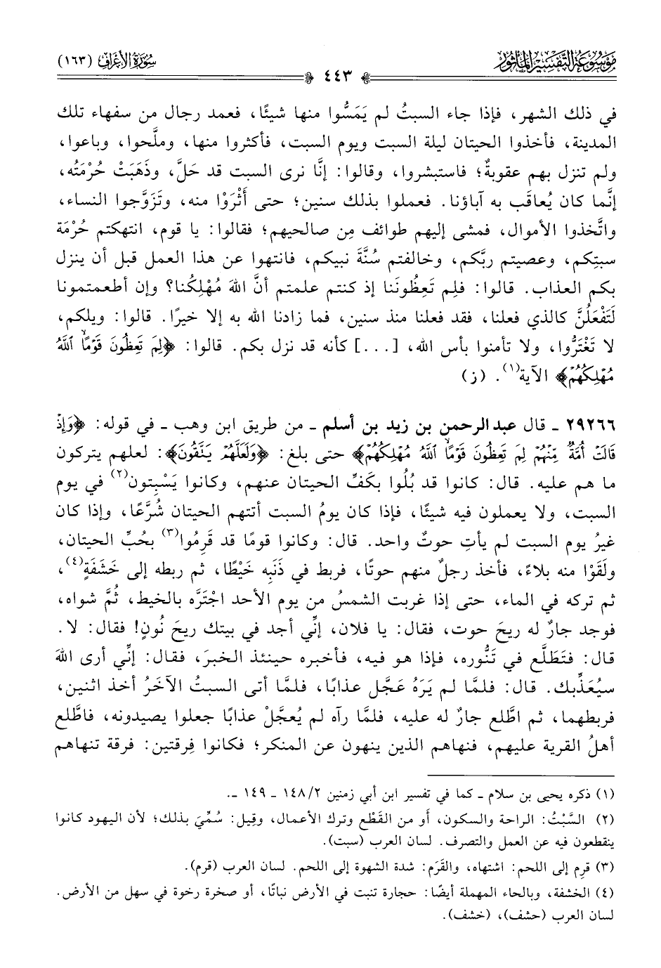 ٢٩٢٦٦ - قال عبد الرحمن بن زيد بن أسلم -من طريق ابن وهب- في قوله: {وإذ قالت أمة منهم لم تعظون قوما الله مهلكهم} حتى بلغ: {ولعلهم يتقون}: لعلهم يتركون ما هم عليه. قال: كانوا قد بُلُوا بكَفِّ الحيتان عنهم، وكانوا يَسْبِتون (¬٢) في يوم السبت، ولا يعملون فيه شيئًا، فإذا كان يومُ السبت أتتهم الحيتان شُرَّعًا، وإذا كان غيرُ يوم السبت لم يأتِ حوتٌ واحد. قال: وكانوا قومًا قد قَرِمُوا (¬٣) بحُبِّ الحيتان، ولَقَوْا منه بلاءً، فأخذ رجلٌ منهم حوتًا، فربط في ذَنَبِه خَيْطًا، ثم ربطه إلى خَشَفَةٍ (¬٤)، ثم تركه في الماء، حتى إذا غربت الشمسُ من يوم الأحد اجْتَرَّه بالخيط، ثُمَّ شواه، فوجد جارٌ له ريحَ حوت، فقال: يا فلان، إنِّي أجد في بيتك ريحَ نُونٍ! فقال: لا. قال: فتَطَلَّع في تَنُّوره، فإذا هو فيه، فأخبره حينئذ الخبرَ، فقال: إنِّي أرى اللهَ سيُعَذِّبك. قال: فلمّا لم يَرَهُ عَجَّل عذابًا، فلمّا أتى السبتُ الآخَرُ أخذ اثنين، فربطهما، ثم اطَّلع جارٌ له عليه، فلمّا رآه لم يُعجَّلْ عذابًا جعلوا يصيدونه، فاطَّلع أهلُ القرية عليهم، فنهاهم الذين ينهون عن المنكر؛ فكانوا فِرقتين: فرقة تنهاهم
