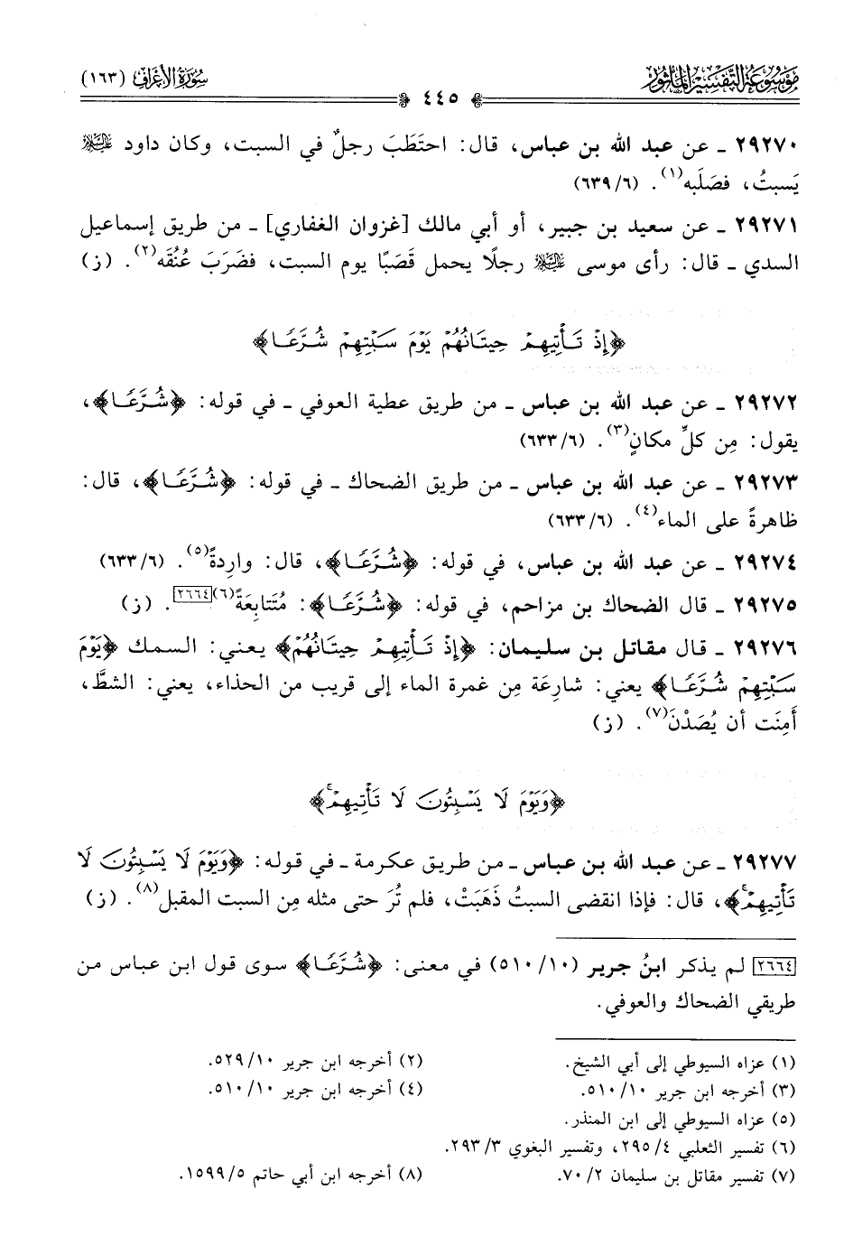 ٢٩٢٧٦ - قال مقاتل بن سليمان: {إذْ تَأْتِيهِمْ حِيتانُهُمْ} يعني: السمك {يَوْمَ سَبْتِهِمْ شُرَّعًا} يعني: شارِعَة مِن غمرة الماء إلى قريب من الحذاء، يعني: الشطَّ، أمِنَت أن يُصَدْنَ (¬٧). (ز)