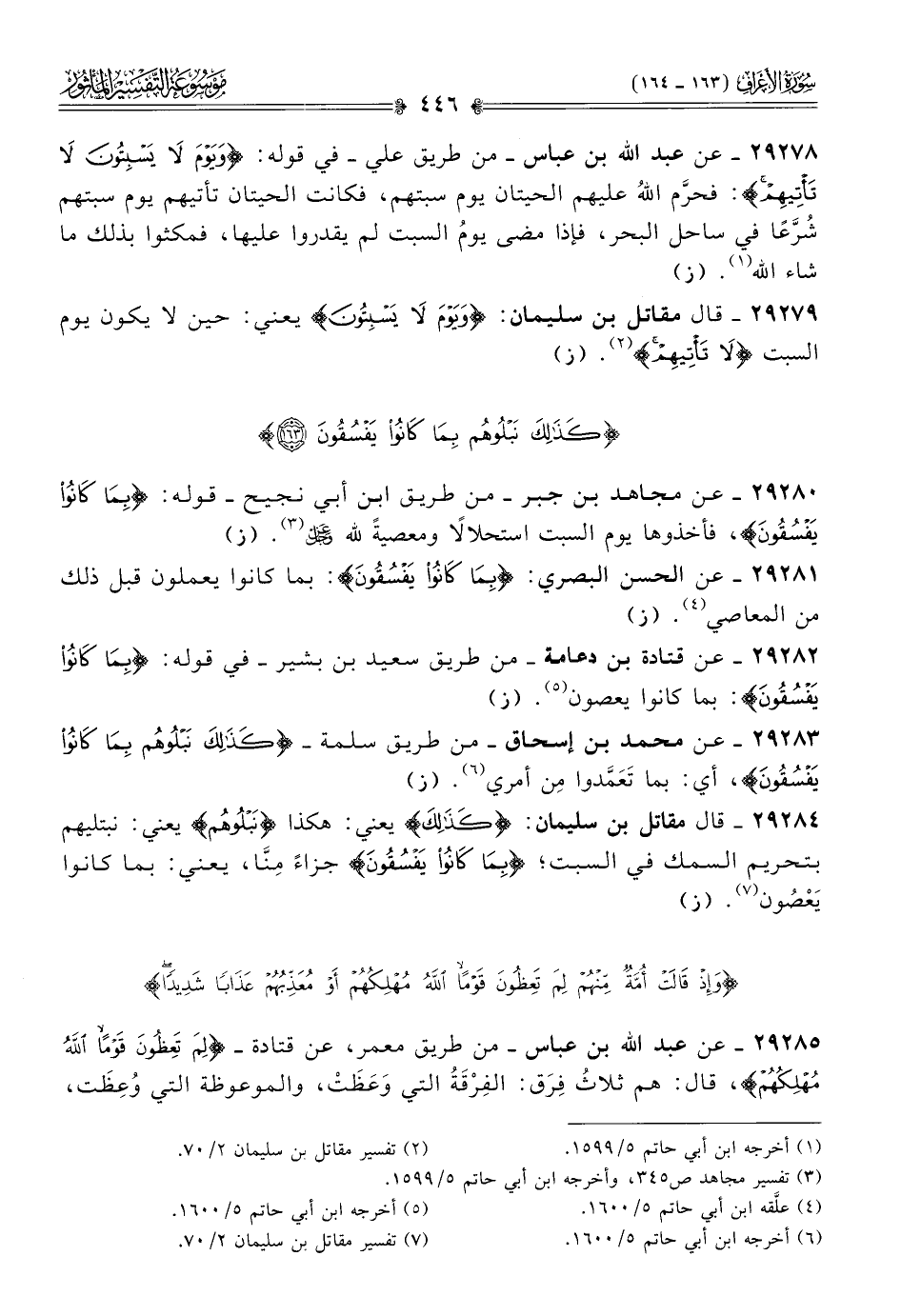 ٢٩٢٧٨ - عن عبد الله بن عباس -من طريق علي- في قوله: {ويَوْمَ لا يَسْبِتُونَ لا تَأْتِيهِمْ}: فحرَّم اللهُ عليهم الحيتان يوم سبتهم، فكانت الحيتان تأتيهم يوم سبتهم شُرَّعًا في ساحل البحر، فإذا مضى يومُ السبت لم يقدروا عليها، فمكثوا بذلك ما شاء الله (¬١). (ز)