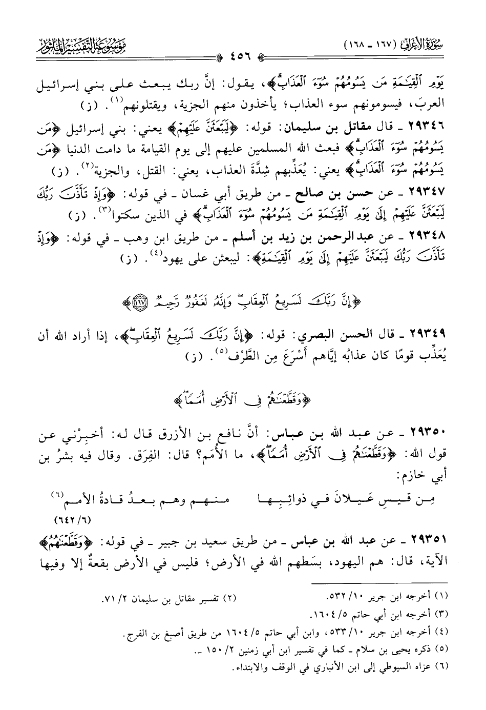 ٢٩٣٤٨ - عن عبد الرحمن بن زيد بن أسلم -من طريق ابن وهب- في قوله: {وإذ تأذن ربك ليبعثن عليهم إلى يوم القيامة}: ليبعثن على يهود (¬٤). (ز)