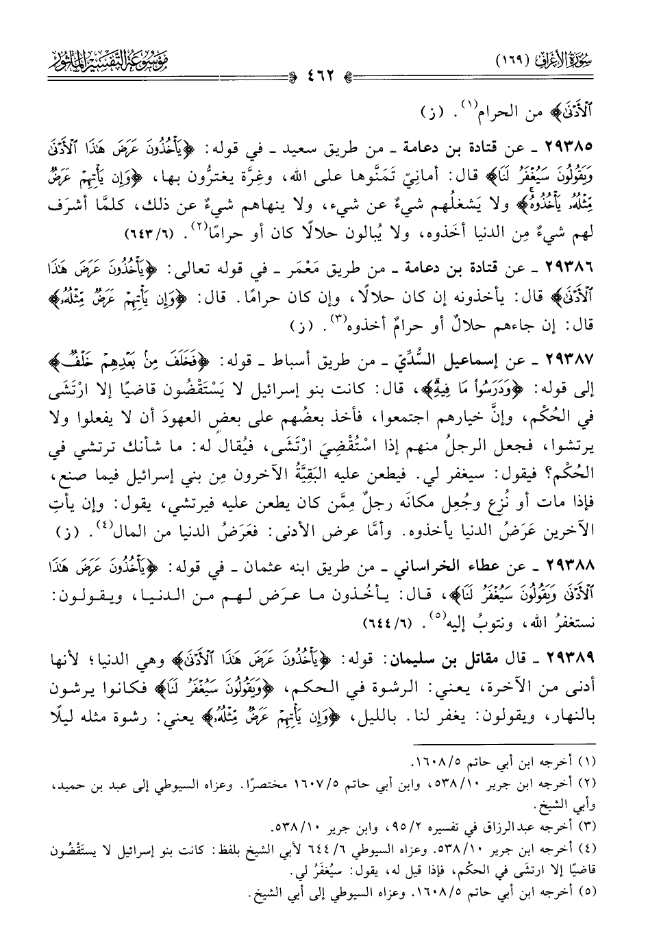 ٢٩٣٨٥ - عن قتادة بن دعامة -من طريق سعيد- في قوله: {يأخذون عرض هذا الأدنى ويقولون سيغفر لنا} قال: أمانِيّ تَمَنَّوها على الله، وغِرَّة يغترُّون بها، {وإن يأتهم عرض مثله يأخذوه} ولا يَشغلُهم شيءٌ عن شيء، ولا ينهاهم شيءٌ عن ذلك، كلمّا أشرَف لهم شيءٌ مِن الدنيا أخَذوه، ولا يُبالون حلالًا كان أو حرامًا (¬٢). (٦/ ٦٤٣)