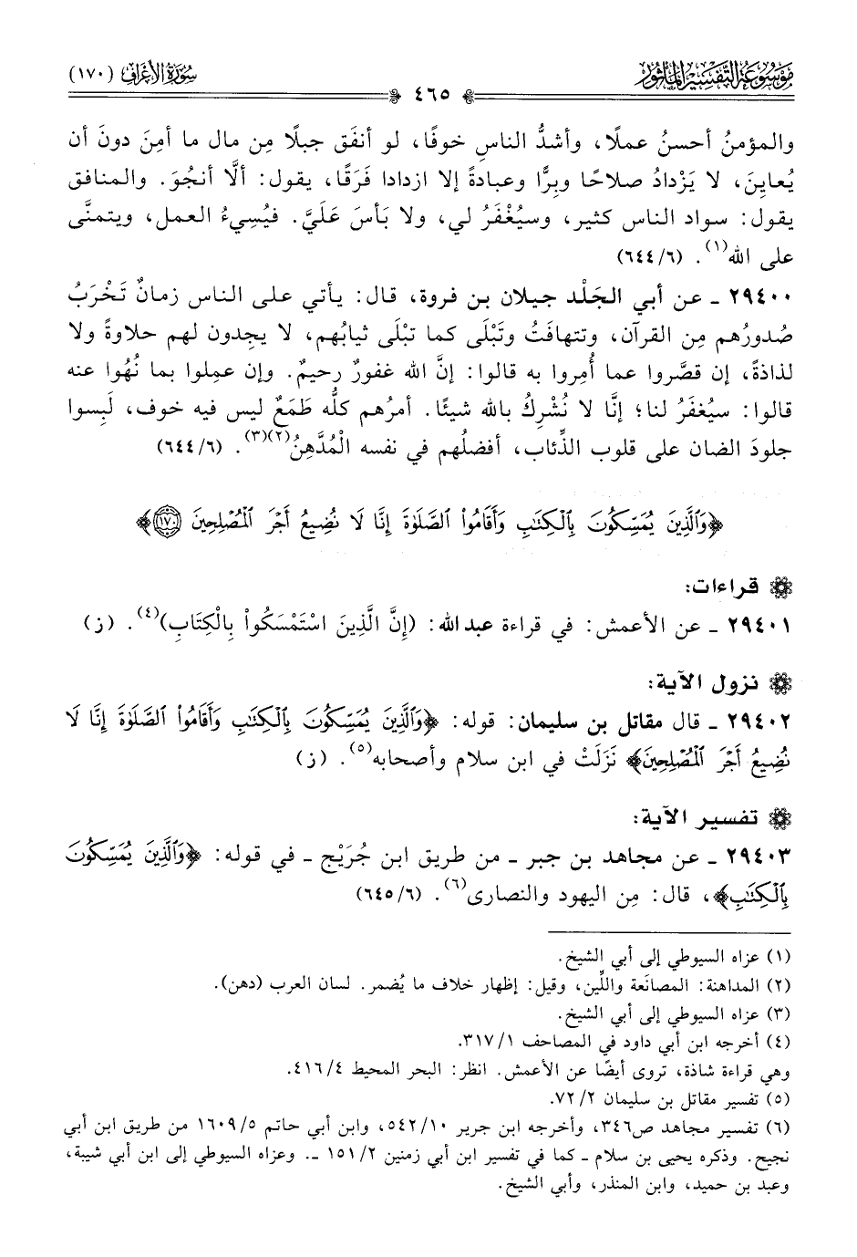 ٢٩٤٠٢ - قال مقاتل بن سليمان: قوله: {والذين يمسكون بالكتاب وأقاموا الصلاة إنا لا نضيع أجر المصلحين} نَزَلَتْ في ابن سلام وأصحابه (¬٥). (ز)