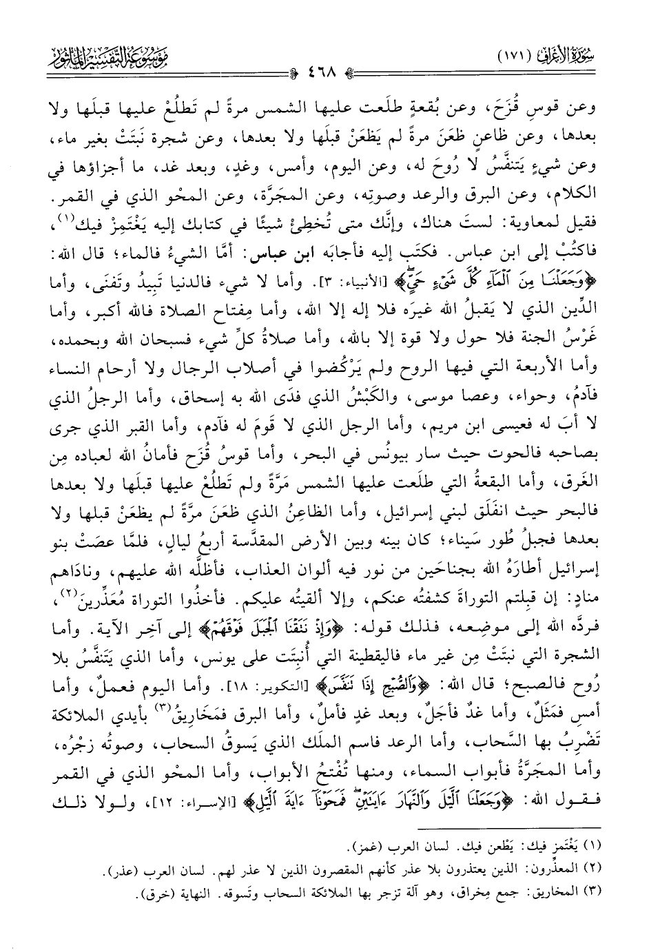 وعن قوسِ قُزَحَ، وعن بُقعةٍ طلَعت عليها الشمس مرةً لم تَطلُعْ عليها قبلَها ولا بعدها، وعن ظاعنٍ ظعَنَ مرةً لم يَظعَنْ قبلَها ولا بعدها، وعن شجرة نَبتَتْ بغير ماء، وعن شيءٍ يَتنفَّسُ لا رُوحَ له، وعن اليوم، وأمس، وغدٍ، وبعد غد، ما أجزاؤها في الكلام، وعن البرق والرعد وصوتِه، وعن المجَرَّة، وعن المحَو الذي في القمر. فقيل لمعاوية: لستَ هناك، وإنّك متى تُخطِئْ شيئًا في كتابك إليه يَغْتَمِزْ فيك (¬١)، فاكتُبْ إلى ابن عباس. فكتَب إليه فأجابَه ابن عباس: أمّا الشيءُ فالماء؛ قال الله: {وجعلنا من الماء كل شيء حي} [الأنبياء: ٣]. وأما لا شيء فالدنيا تَبِيدُ وتَفنى، وأما الدِّين الذي لا يَقبلُ الله غيرَه فلا إله إلا الله، وأما مِفتاح الصلاة فالله أكبر، وأما غَرْسُ الجنة فلا حول ولا قوة إلا بالله، وأما صلاةُ كلِّ شيء فسبحان الله وبحمده، وأما الأربعة التي فيها الروح ولم يَرْكُضوا في أصلاب الرجال ولا أرحام النساء فآدمُ، وحواء، وعصا موسى، والكَبْشُ الذي فدى الله به إسحاق، وأما الرجلُ الذي لا أبَ له فعيسى ابن مريم، وأما الرجل الذي لا قَومَ له فآدم، وأما القبر الذي جرى بصاحبه فالحوت حيث سار بيونُس في البحر، وأما قوسُ قُزَح فأمانُ الله لعباده مِن الغَرق، وأما البقعةُ التي طلَعت عليها الشمس مَرَّةً ولم تَطلُعْ عليها قبلَها ولا بعدها فالبحر حيث انفَلَق لبني إسرائيل، وأما الظاعِنُ الذي ظعَنَ مرَّةً لم يظعَنْ قبلها ولا بعدها فجبلُ طُور سَيناء؛ كان بينه وبين الأرض المقدَّسة أربعُ ليالٍ، فلمّا عصَتْ بنو إسرائيل أطارَهُ الله بجناحَين من نور فيه ألوان العذاب، فأظلَّه الله عليهم، وناداهم منادٍ: إن قبِلتم التوراةَ كشفتُه عنكم، وإلا ألقيتُه عليكم. فأخذُوا التوراة مُعَذِّرينَ (¬٢)، فردَّه الله إلى موضِعه، فذلك قوله: {وإذ نتقنا الجبل فوقهم} إلى آخِر الآية. وأما الشجرة التي نبتَتْ مِن غير ماء فاليقطينة التي أُنبِتَت على يونس، وأما الذي يَتَنفَّسُ بلا رُوح فالصبح؛ قال الله: {والصبح إذا تنفس} [التكوير: ١٨]. وأما اليوم فعملٌ، وأما أمسِ فمَثَلٌ، وأما غدٌ فأجَلٌ، وبعد غدٍ فأملٌ، وأما البرق فمَخارِيقُ (¬٣) بأيدي الملائكة تَضْرِبُ بها السَّحاب، وأما الرعد فاسم الملَك الذي يَسوقُ السحاب، وصوتُه زجْرُه، وأما المجَرَّةُ فأبواب السماء، ومنها تُفْتحُ الأبواب، وأما المحْو الذي في القمر فقول الله: {وجعلنا الليل والنهار آيتين فمحونا آية الليل} [الإسراء: ١٢]، ولولا ذلك