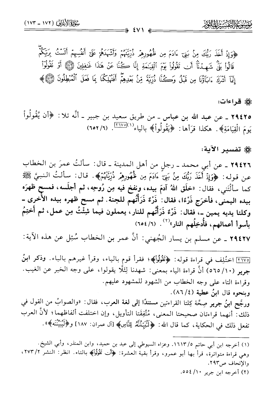 [٢٦٧٥] اختُلِف في قراءة قوله: {تقولوا}؛ فقرأ قوم بالياء، وقرأ غيرهم بالباء. وذكر ابنُ جرير (١٠/ ٥٦٥) أنّ قراءة الياء بمعنى: شهدنا لِئَلّا يقولوا، على وجه الخبر عن الغيب. وقراءة التاء على وجه الخطاب من الشهود للمشهود عليهم.