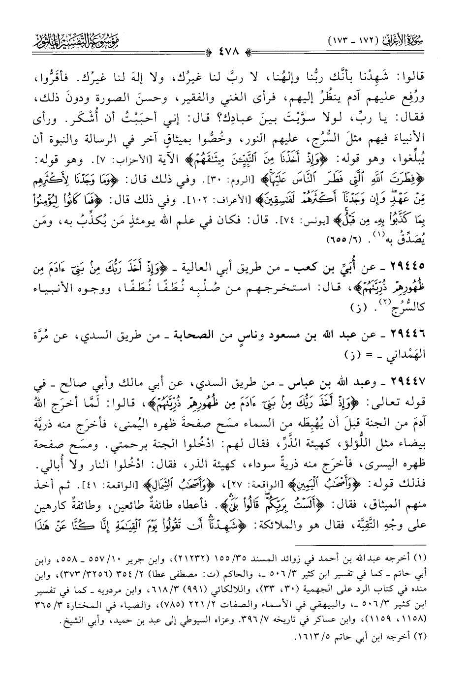٢٩٤٤٧ - وعبد الله بن عباس -من طريق السدي، عن أبي مالك وأبي صالح- في قوله تعالى: {وإذ أخَذ ربُّك مِن بَنِي آدمَ مِن ظُهورِهم ذُرِّيّاتِهم}، قالوا: لَمّا أخرَج اللهُ آدمَ من الجنة قبلَ أن يُهْبِطَه من السماء مسَح صفحةَ ظهره اليُمنى، فأخرَج منه ذريَّة بيضاء مثل اللُّؤلؤ، كهيئة الذَّرِّ، فقال لهم: ادْخُلوا الجنة برحمتي. ومسَح صفحة ظهره اليسرى، فأخرَج منه ذريةً سوداء، كهيئة الذر، فقال: ادْخُلوا النار ولا أُبالي. فذلك قوله: {وأصحاب اليمين} [الواقعة: ٢٧]، {وأصحاب الشمال} [الواقعة: ٤١]. ثم أخذ منهم الميثاق، فقال: {ألست بربكم قالوا بلى}. فأعطاه طائفةٌ طائعين، وطائفةٌ كارهين على وجْهِ التَّقِيَّة، فقال هو والملائكة: {شهدنا أن تقولوا يوم القيامة إنا كنا عن هذا