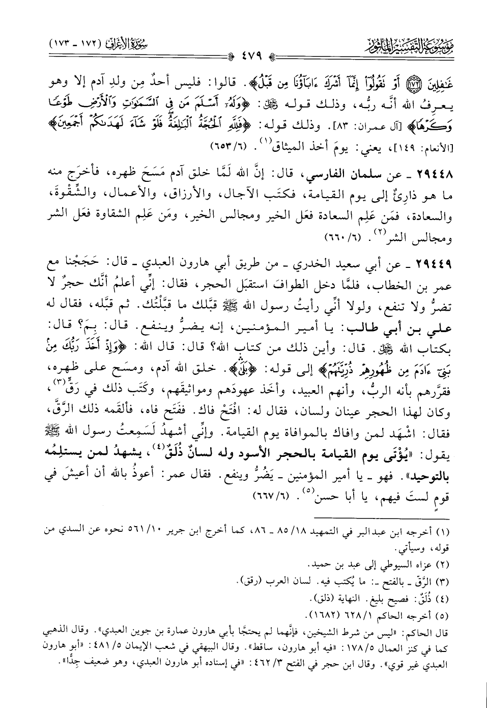 ٢٩٤٤٩ - عن أبي سعيد الخدري -من طريق أبي هارون العبدي- قال: حَجَجْنا مع عمر بن الخطاب، فلمّا دخل الطوافَ استقبَل الحجر، فقال: إنِّي أعلمُ أنّك حجرٌ لا تضرُّ ولا تنفع، ولولا أنِّي رأيتُ رسول الله - صلى الله عليه وسلم - قبَّلك ما قبَّلْتُك. ثم قبَّله، فقال له علي بن أبي طالب: يا أمير المؤمنين، إنه يضرُّ وينفع. قال: بِمَ؟ قال: بكتاب الله - عز وجل -. قال: وأين ذلك من كتاب الله؟ قال: قال الله: {وإذ أخذ ربك من بني آدم من ظهورهم ذريتهم} إلى قوله: {بلى}. خلق الله آدم، ومسَح على ظهره، فقرَّرهم بأنه الربُّ، وأنهم العبيد، وأخَذ عهودَهم ومواثيقَهم، وكَتَب ذلك في رَقٍّ (¬٣)، وكان لهذا الحجر عينان ولسان، فقال له: افْتَحْ فاك. ففَتَح فاه، فألقَمه ذلك الرَّقَّ، فقال: اشْهَد لمن وافاك بالموافاة يوم القيامة. وإنِّي أشهدُ لَسَمِعتُ رسول الله - صلى الله عليه وسلم - يقول: «يُؤْتى يوم القيامة بالحجر الأسود وله لسانٌ ذُلَقٌ (¬٤)، يشهدُ لمن يستلِمُه بالتوحيد». فهو -يا أمير المؤمنين- يَضُرُّ وينفع. فقال عمر: أعوذُ بالله أن أعيشَ في قومٍ لستَ فيهم، يا أبا حسن (¬٥). (٦/ ٦٦٧)