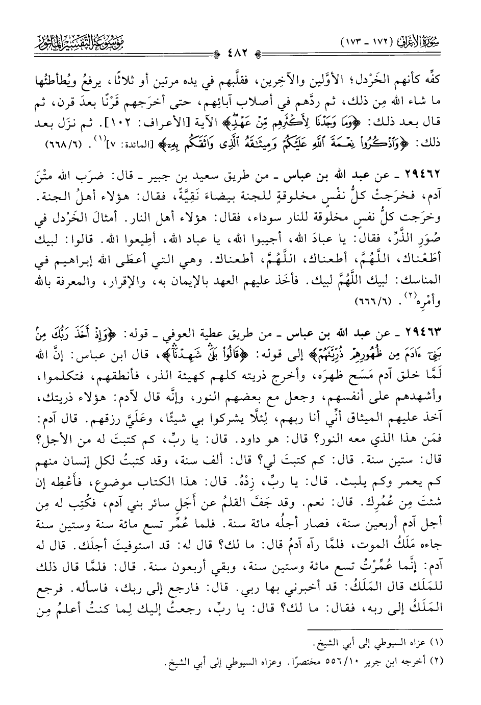 ٢٩٤٦٣ - عن عبد الله بن عباس -من طريق عطية العوفي- قوله: {وإذ أخذ ربك من بني آدم من ظهورهم ذريتهم} إلى قوله: {قالوا بلى شهدنا}، قال ابن عباس: إنّ الله لَمّا خلق آدم مَسَح ظهرَه، وأخرج ذريته كلهم كهيئة الذر، فأنطقهم، فتكلموا، وأشهدهم على أنفسهم، وجعل مع بعضهم النور، وإنّه قال لآدم: هؤلاء ذريتك، آخذ عليهم الميثاق أنِّي أنا ربهم، لِئلّا يشركوا بي شيئًا، وعَلَيَّ رزقهم. قال آدم: فمَن هذا الذي معه النور؟ قال: هو داود. قال: يا ربِّ، كم كتبتَ له من الأجل؟ قال: ستين سنة. قال: كم كتبتَ لي؟ قال: ألف سنة، وقد كتبتُ لكل إنسان منهم كم يعمر وكم يلبث. قال: يا ربِّ، زِدْهُ. قال: هذا الكتاب موضوع، فأَعْطِه إن شئتَ مِن عُمُرِك. قال: نعم. وقد جَفَّ القلمُ عن أجَلِ سائر بني آدم، فكُتِب له مِن أجل آدم أربعين سنة، فصار أجلُه مائة سنة. فلما عُمِّر تسع مائة سنة وستين سنة جاءه مَلَكُ الموت، فلمّا رآه آدمُ قال: ما لك؟ قال له: قد استوفيتَ أجلَك. قال له آدم: إنّما عُمِّرْتُ تسع مائة وستين سنة، وبقي أربعون سنة. قال: فلمّا قال ذلك للمَلَك قال المَلَكُ: قد أخبرني بها ربي. قال: فارجع إلى ربك، فاسأله. فرجع المَلَكُ إلى ربه، فقال: ما لك؟ قال: يا ربِّ، رجعتُ إليك لِما كنتُ أعلمُ مِن