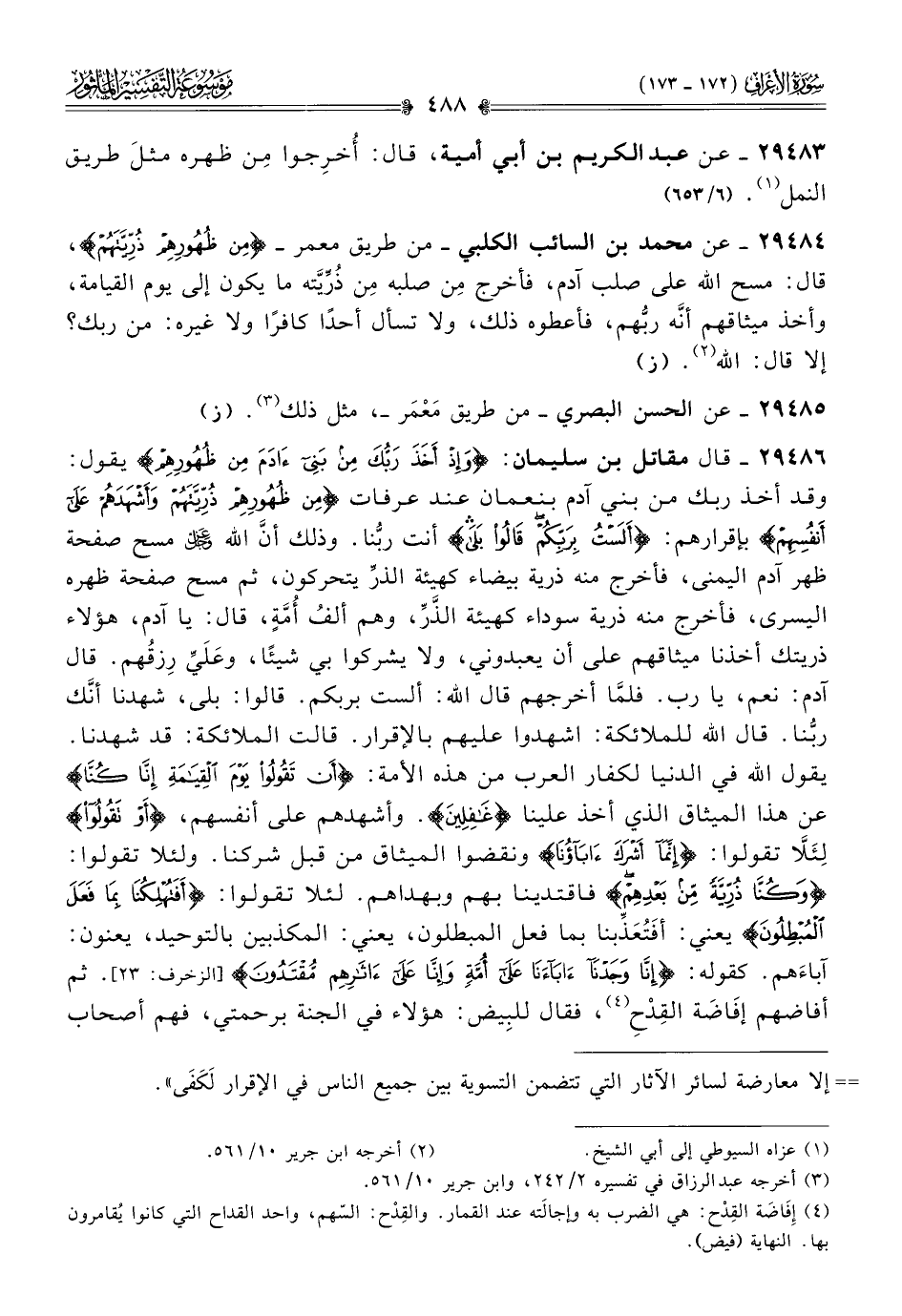 ٢٩٤٨٦ - قال مقاتل بن سليمان: {وإذ أخذ ربك من بني آدم من ظهورهم} يقول: وقد أخذ ربك من بني آدم بنعمان عند عرفات {من ظهورهم ذريتهم وأشهدهم على أنفسهم} بإقرارهم: {ألست بربكم قالوا بلى} أنت ربُّنا. وذلك أنّ الله - عز وجل - مسح صفحة ظهر آدم اليمنى، فأخرج منه ذرية بيضاء كهيئة الذرِّ يتحركون، ثم مسح صفحة ظهره اليسرى، فأخرج منه ذرية سوداء كهيئة الذَّرِّ، وهم ألفُ أُمَّةٍ، قال: يا آدم، هؤلاء ذريتك أخذنا ميثاقهم على أن يعبدوني، ولا يشركوا بي شيئًا، وعَلَيِّ رِزقُهم. قال آدم: نعم، يا رب. فلمّا أخرجهم قال الله: ألست بربكم. قالوا: بلى، شهدنا أنّك ربُّنا. قال الله للملائكة: اشهدوا عليهم بالإقرار. قالت الملائكة: قد شهدنا. يقول الله في الدنيا لكفار العرب من هذه الأمة: {أن تقولوا يوم القيامة إنا كنا} عن هذا الميثاق الذي أخذ علينا {غافلين}. وأشهدهم على أنفسهم، {أو تقولوا} لِئَلّا تقولوا: {إنما أشرك آباؤنا} ونقضوا الميثاق من قبل شركنا. ولئلا تقولوا: {وكنا ذرية من بعدهم} فاقتدينا بهم وبهداهم. لئلا تقولوا: {أفتهلكنا بما فعل المبطلون} يعني: أفَتُعَذِّبنا بما فعل المبطلون، يعني: المكذبين بالتوحيد، يعنون: آباءَهم. كقوله: {إنا وجدنا آباءنا على أمة وإنا على آثارهم مقتدون} [الزخرف: ٢٣]. ثم أفاضهم إفاضَة القِدْحِ (¬٤)، فقال للبِيض: هؤلاء في الجنة برحمتي، فهم أصحاب
