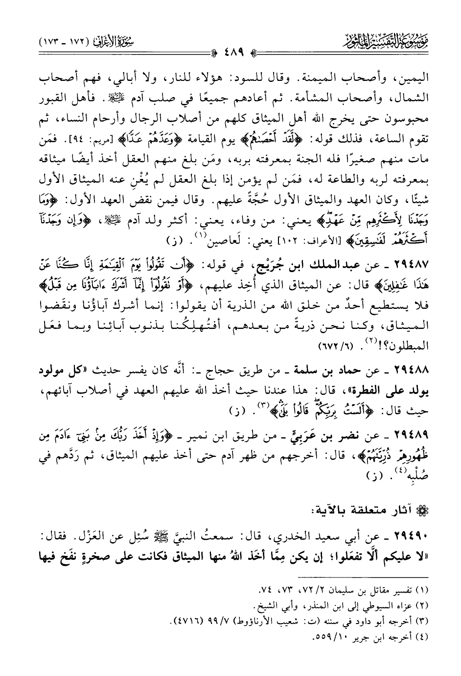 ٢٩٤٨٩ - عن نضر بن عَرَبِيٍّ -من طريق ابن نمير- {وإذ أخذ ربك من بني آدم من ظهورهم ذريتهم}، قال: أخرجهم من ظهر آدم حتى أخذ عليهم الميثاق، ثم رَدَّهم في صُلْبِه (¬٤). (ز)